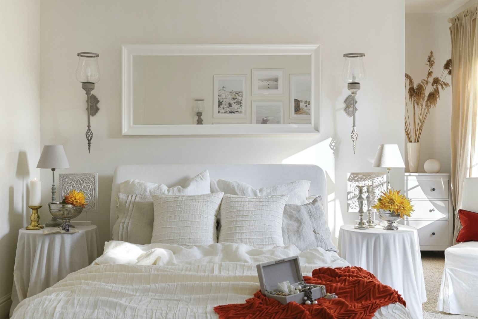 Wiele mebli i dodatków właścicielka znalazła w sieciówkach, ale tak dobrze je ze sobą połączyła, że to, co drogie, z tym, co tańsze, idealnie do siebie pasuje. Stół jadalny i krzesła, zasłony oraz łóżko są z IKEA, konsola obok holu i ozdobna waza z TK Maxx, kosze i tapicerowana ławeczka z Jysk, zaś ozdobne płaskorzeźby na nocnych stolikach i dekoracyjny manekin z Netto. W tych sklepach co roku poluje też na nowe dekoracje świąteczne – zawsze trafi na coś ładnego i… pod kolor. Jasny oczywiście.