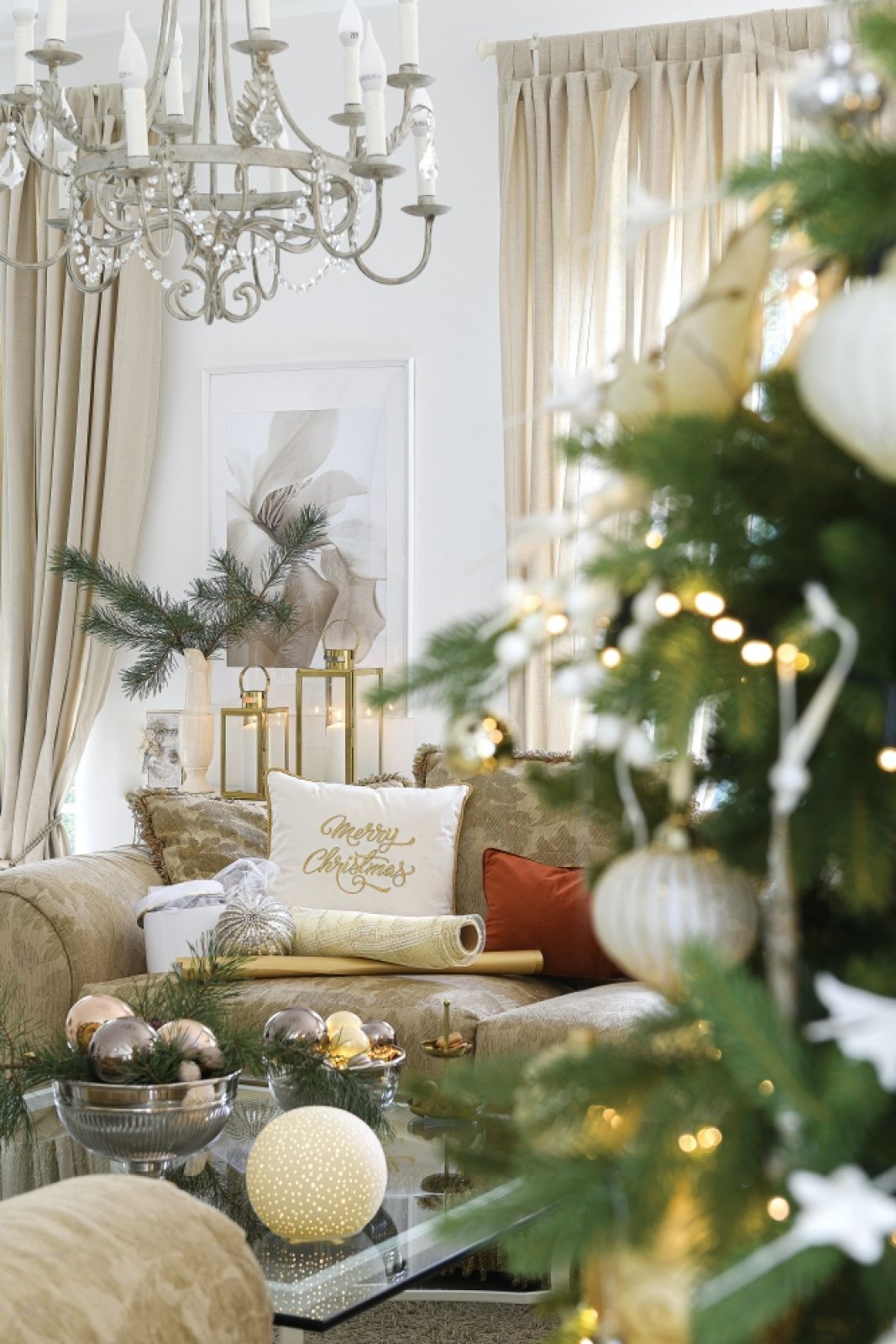 RezydencjeEwa kocha biel – w tym kolorze ma ubrania i dom. Gdy przychodzi Boże Narodzenie, pojawia się jeszcze złoto. – Dom z okazji świąt przystrajamy już w pierwszy weekend grudnia – opowiada Ewa. – Czasem żal mi zdejmować świąteczne oświetlenie, więc wisi do końca stycznia. Zielone drzewka udekoruje białymi i złociście świecącymi lampkami oraz podobnymi ozdobami. To nie przypadek – złoto i beż to jej ukochane kolory.