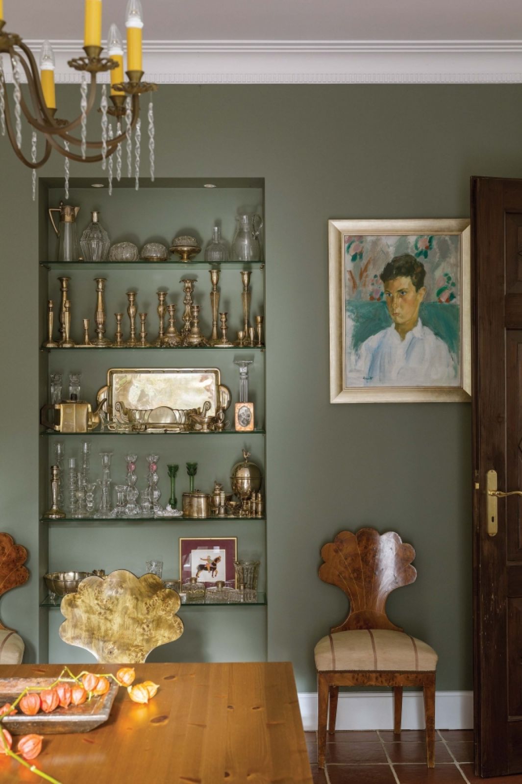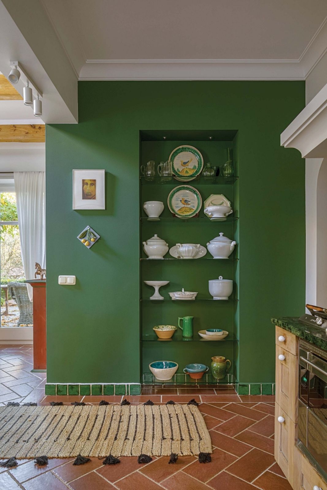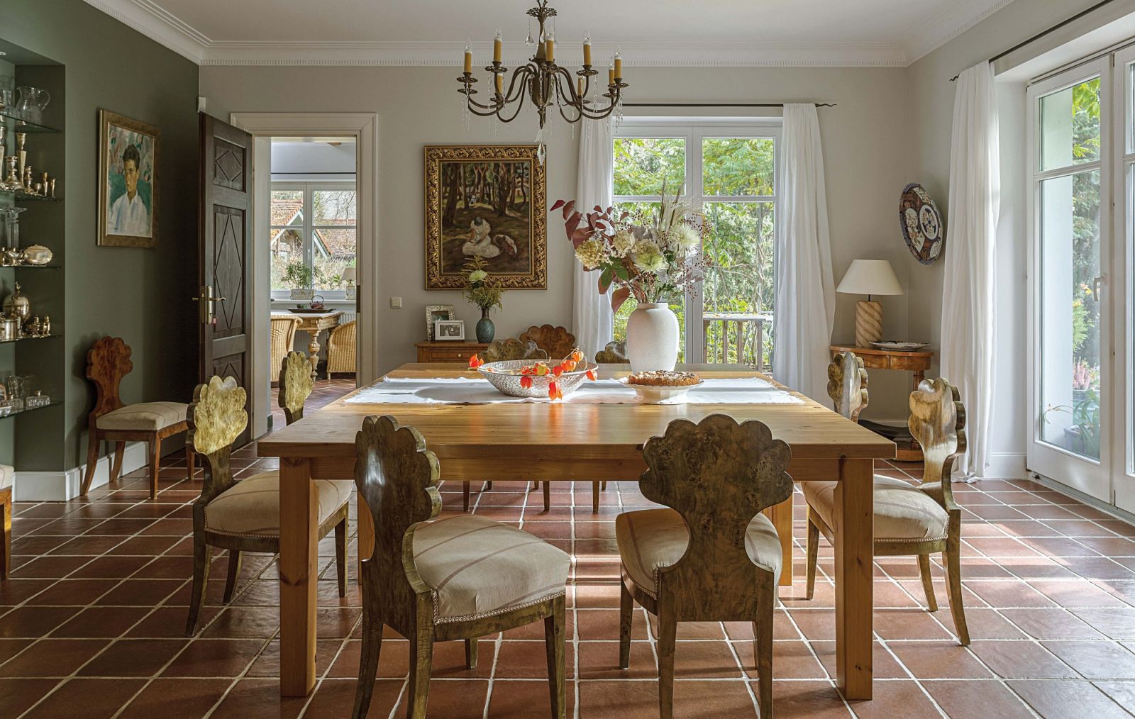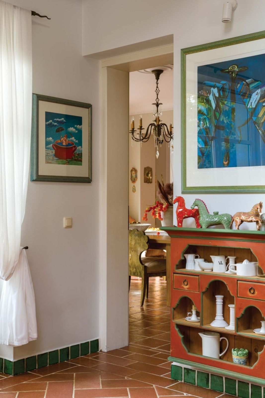 Teraz, po latach Teresa odmieniła nieco oblicze willi. Kolor na ścianach dostosowała do podłogowych płytek i cokolików. Kuchnię i salon pomalowała w działających kojąco odcieniach ziołowej zieleni, która ładnie pasuje do bieli. Zadbała, by wszystko dobrze komponowało się ze zbieranymi od lat meblami – od biedermeierowskich krzeseł po XIX-wieczne meble kolonialne. Współczesnym akcentem są eleganckie sofy od SITS. Wnętrza zdobią pamiątki i bibeloty przywiezione z dalszych i bliższych podróży – ostatnio z Wietnamu. Właścicielka mówi o sobie żartem, że ma naturę sroki, ale jej zbiory na pewno nie są przypadkowe.