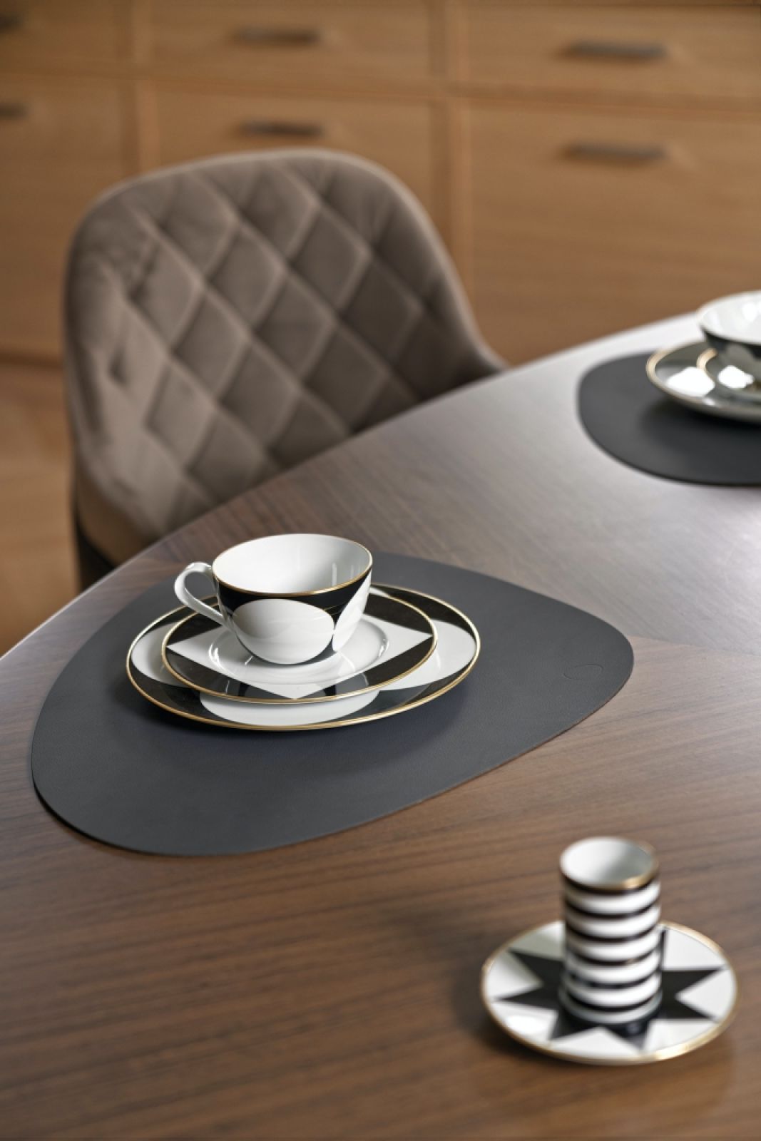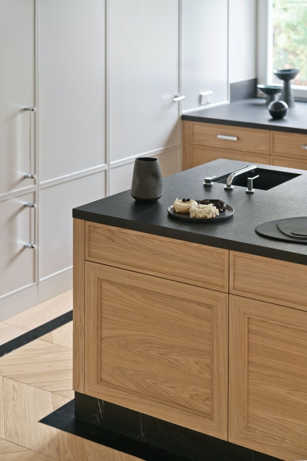 Wiele mebli zaprojektowałam sama. Na przykład stolik kawowy, stół jadalny i ten w wykuszu w kuchni, wszystkie na charakterystycznych walcowatych nogach. Mojego projektu są też krzesła, kominek oraz szafki kuchenne. Bardzo ważna była klatka schodowa i hol. Zależało mi, żeby nadać im czystą i prostą formę, utrzymaną w czerni i bieli z elementami złota. Do tego naturalne drewno dębowe. To tę część domu najpierw widzą goście, więc musiała robić wrażenie.