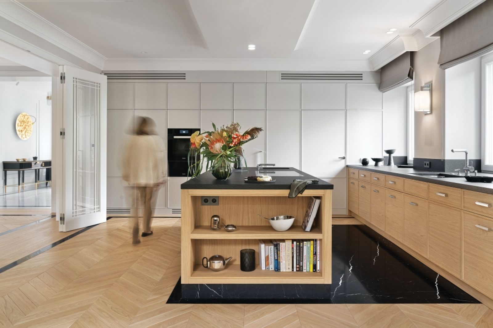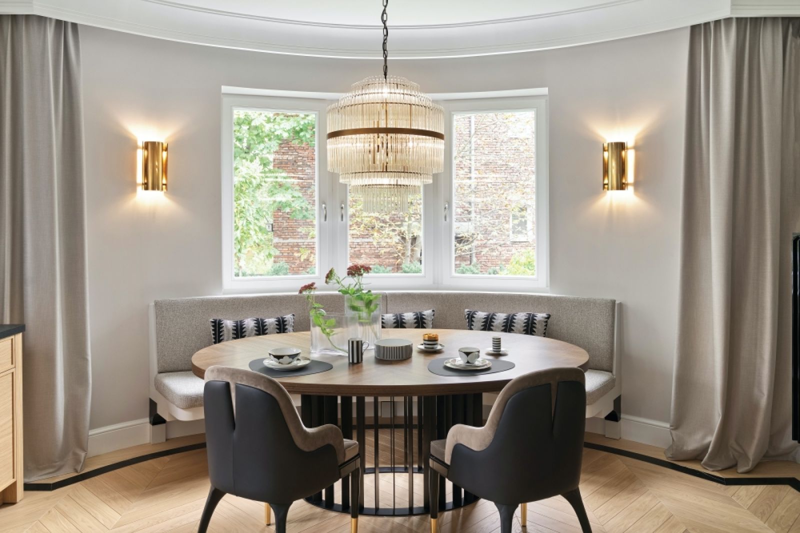 Moim własnym pomysłem było za to oddzielenie kuchni od salonu przeszklonymi czteroskrzydłowymi drzwiami. Zainspirowały mnie rozwiązania z okresu międzywojennego. Początkowo miała to być jedna przestrzeń. Rozdzielenie salonu i kuchni to dla mnie bardzo praktyczne rozwiązanie i choć trochę wbrew obecnym trendom, sprawdza się w codziennym życiu. Ja zaś, mimo, że mamy też w domu gabinet, zyskałam dodatkowe miejsce do pracy. Lubię zamknąć drzwi dzielące salon i kuchnię, usiąść z laptopem przy okrągłym stole w wykuszu pod oknem z kubkiem gorącej kawy. Zawsze to jakaś odmiana, gdy pracuje się w domowym biurze. Dom nam się sprawdził podczas pandemii i lockdownu, co chyba najlepiej świadczy o jego funkcjonalności. Ale przyznam, że nie mogę się doczekać powrotu do normalności.
