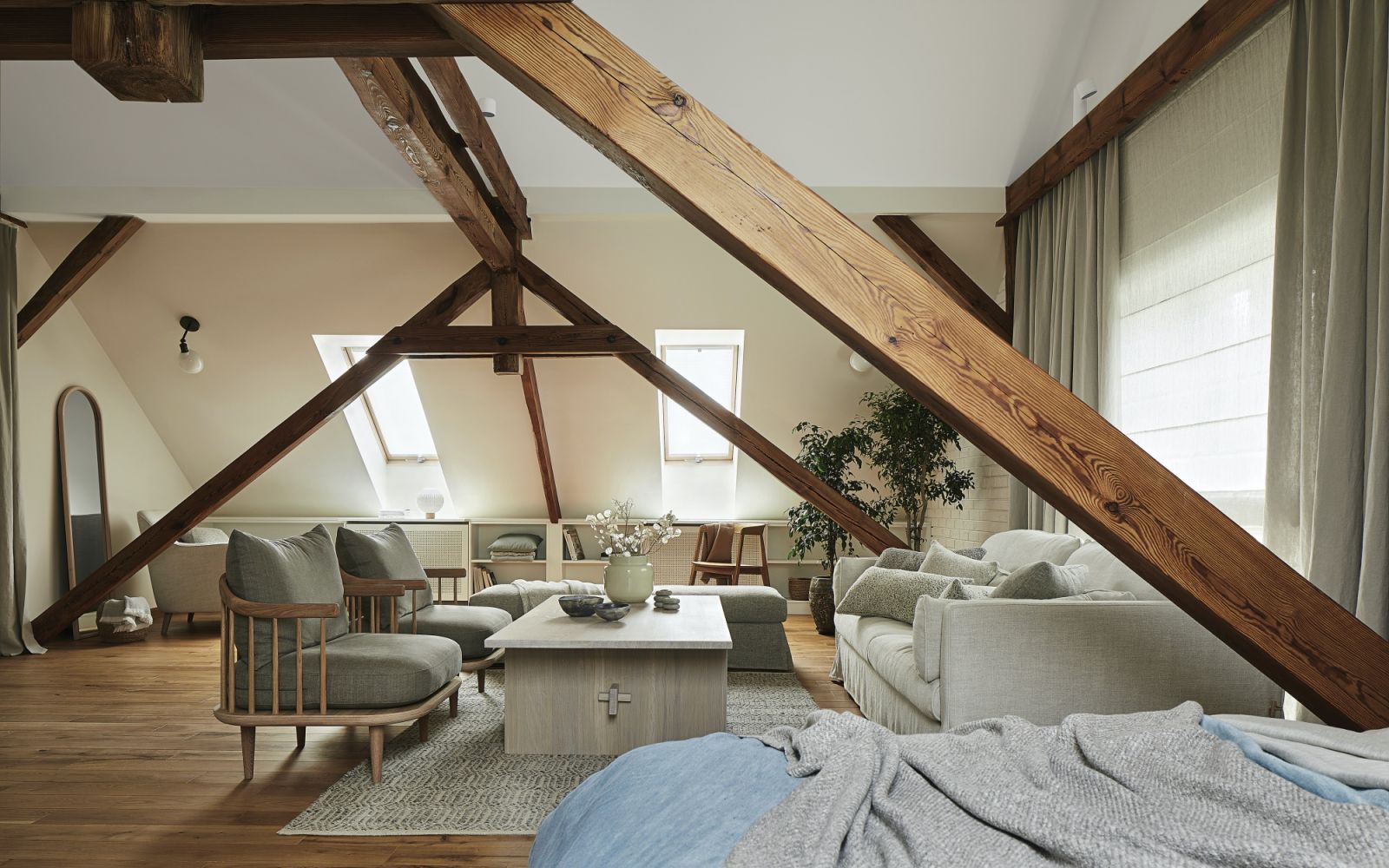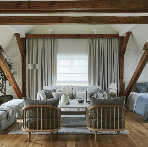 Czasy się zmieniały i w latach 90. XX wieku Ela z Januszem wykupili część popegeerowskich budynków i przerobili je na dom oraz biura firmy ogrodniczej, którą prowadzi córka. W pozostałych nadal działa ich rolnicze gospodarstwo. W dawnej mleczarni – do której dobudowali klatkę schodową, bo wcześniej na górę wchodziło się po drabinie – urządzili miejsce do pracy i odpoczynku dla siebie oraz swoich gości. O zaprojektowanie wnętrza poprosili zaprzyjaźnioną pracownię Jam Kolektyw. – Zależało nam na stworzeniu naturalnego wnętrza, sprzyjającego relaksowi, dopasowanego do potrzeb właścicieli, którzy są starszymi ludźmi – opowiada projektantka Anna Olga Chmielewska.