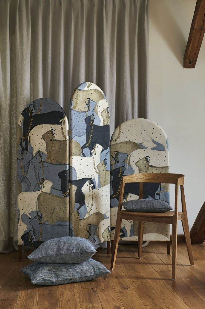 Ela kocha szlachetne tkaniny, a szczególnie len, dlatego pojawia się on w całym domu. Z tkaniny o grubszym splocie uszyte zostały zasłony, z przejrzystej – rolety, a z lnu z dodatkiem bawełny i sizalu duńska manufaktura Linie Design utkała dywany. Specjalnie do tego wnętrza. Także stojący przy łóżku parawan z motywem krów został zrobiony z lnu Güell Lamadrid. – Zaprojektowałyśmy go, by nadać intymności niewielkiej sypialni zaaranżowanej w części poddasza. Gdy zobaczyłyśmy len z błękitnymi krowami, od razu wiedziałyśmy, że wykorzystamy go we wnętrzach pniewskiej mleczarenki – tłumaczy Anna Olga Chmielewska.
