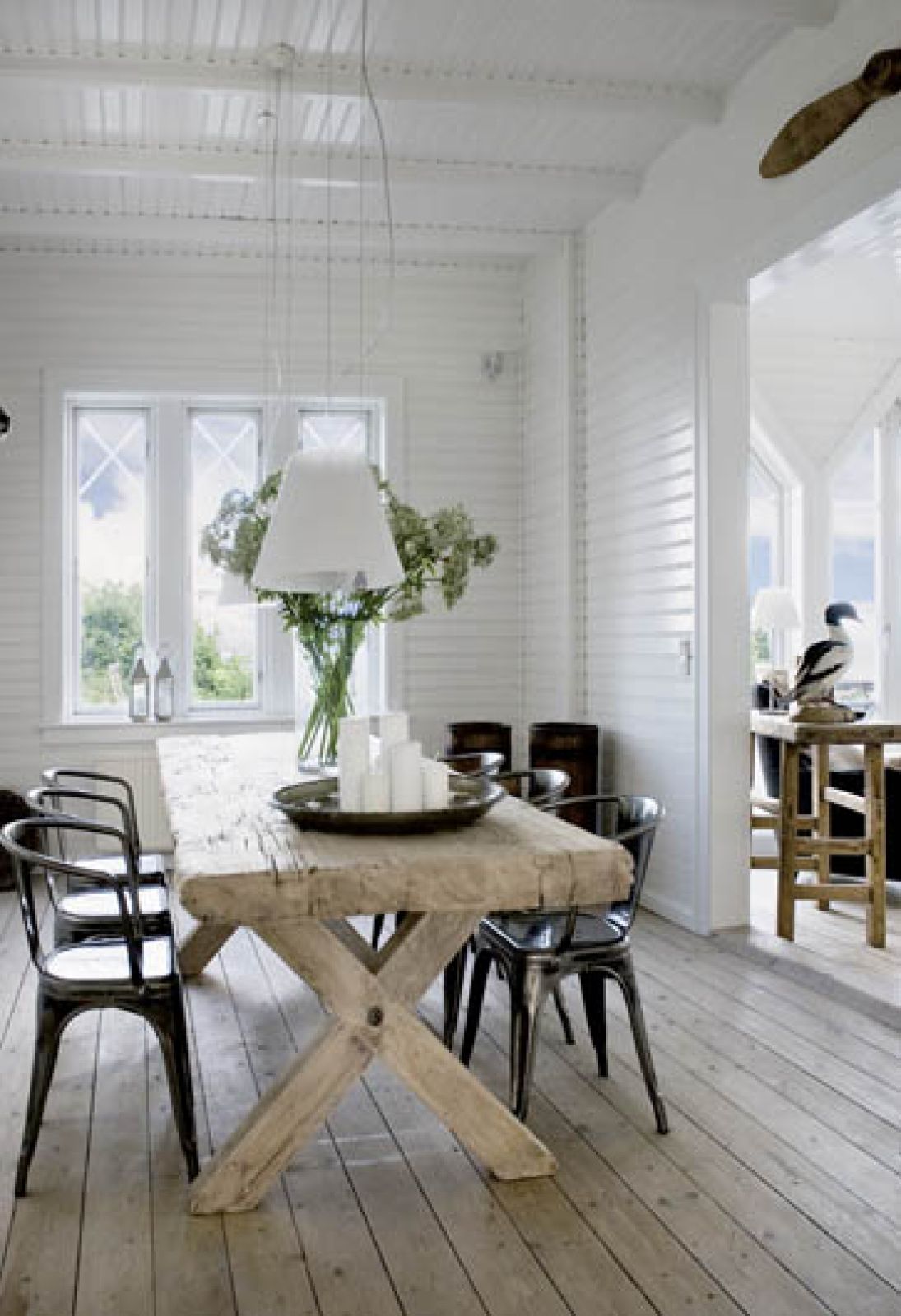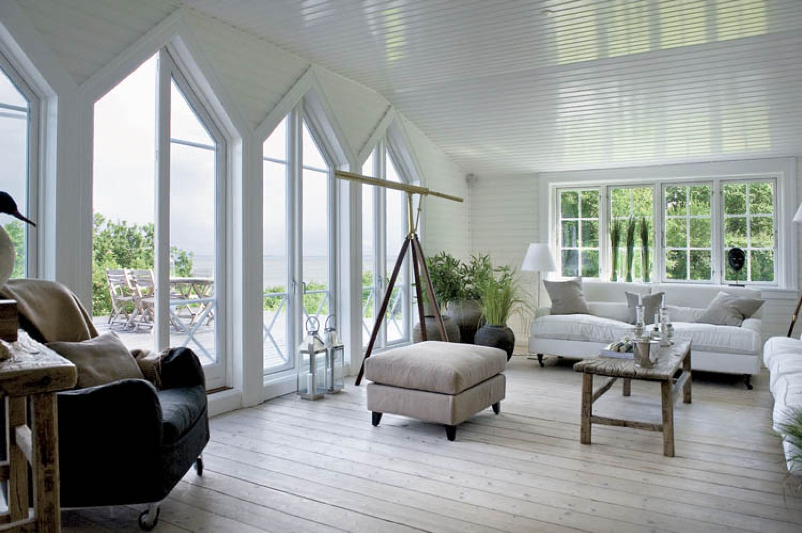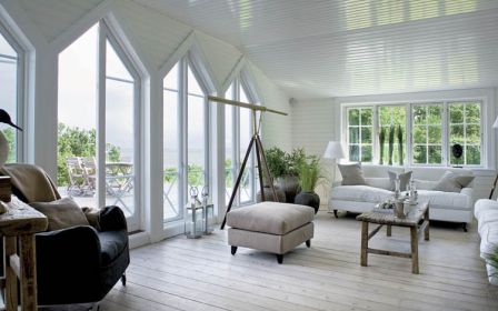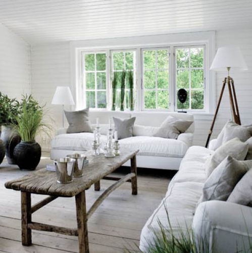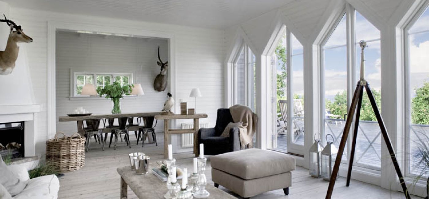 Thomas urządził się tak, by wnętrza pasowały do widoku za oknem. Przeważają jasne kolory (biel, beże, barwy ziemi) i surowe spękane drewno, typowe dla stylu New England.