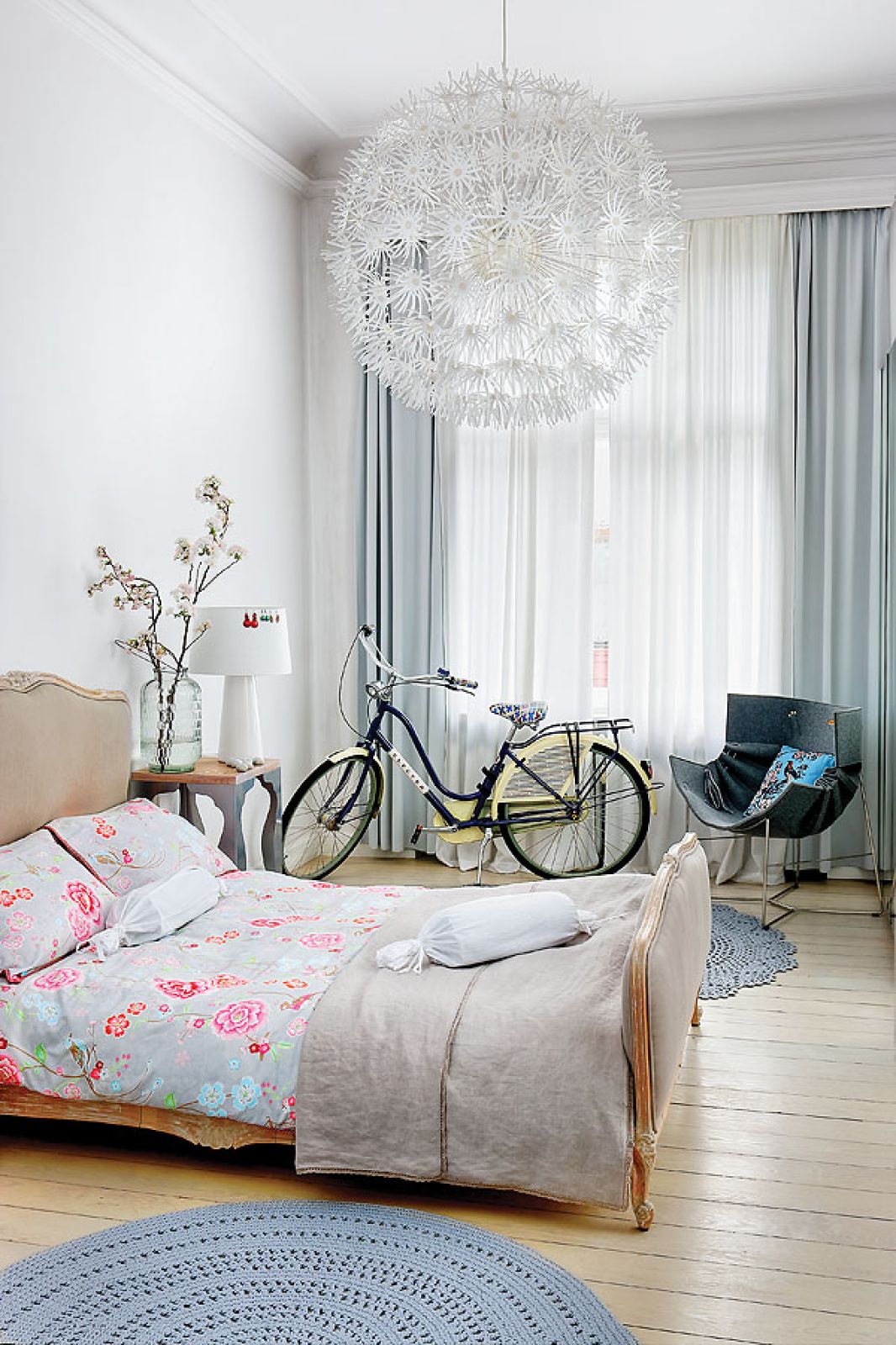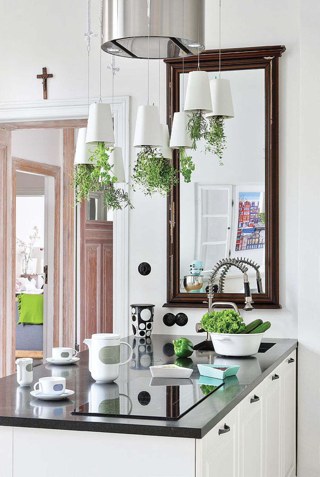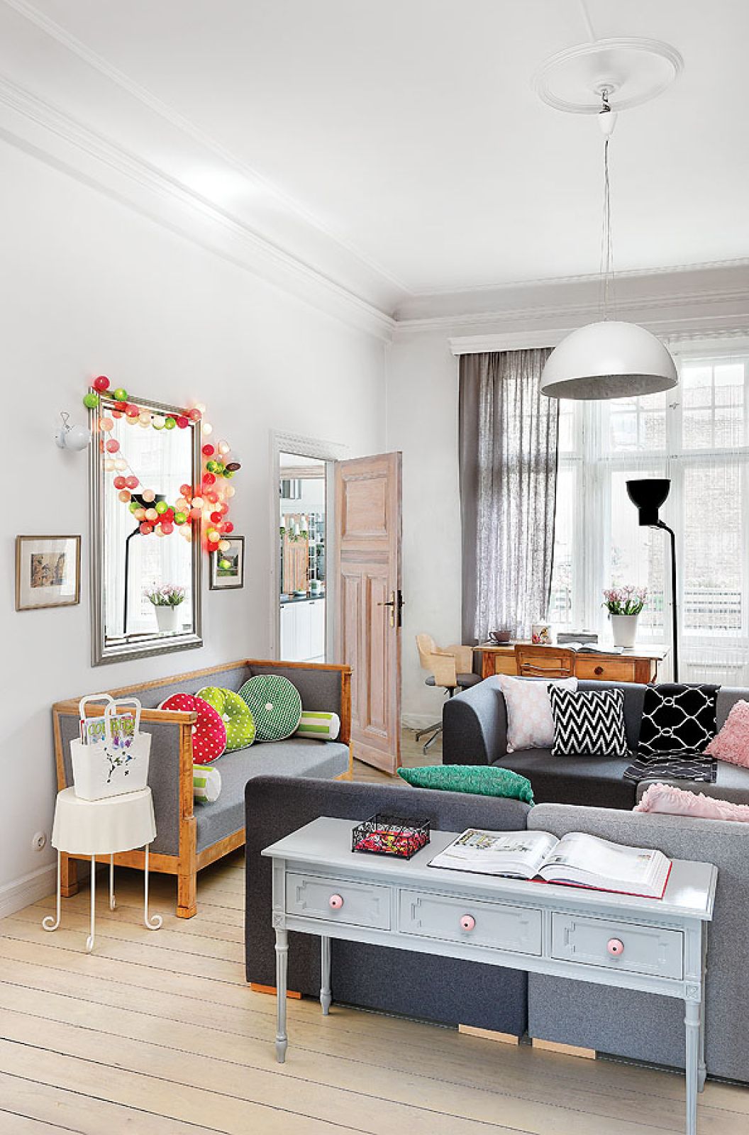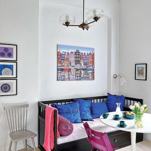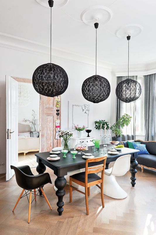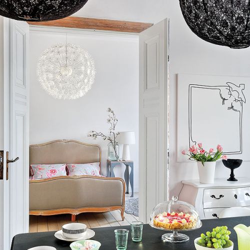 Powstało więc mieszkanie celowo pomieszane, bo takie, zdaniem Sylwii, są ciekawsze i mniej oczywiste. W klasycznych wnętrzach lubi dodawać nowoczesne akcenty, stara się wyszukiwać polski dizajn od młodych projektantów. Jest rodowitą Kurpianką, świetnie szydełkuje, nauczyły ją tego mama i babcia. Sama zrobiła więc dywan do pokoju córek i sypialni oraz abażury kinkietów w pokoiku przy kuchni.