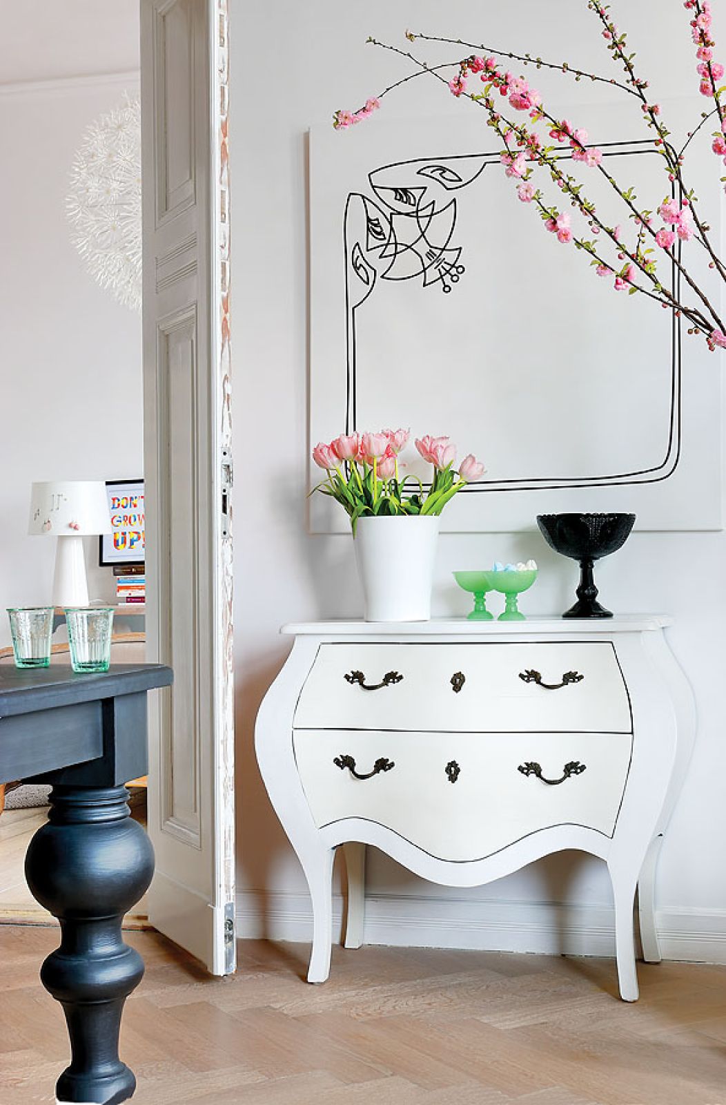 W wir remontowania rzucili się razem z Robertem: szlifowali i malowali meble, które wcześniej licytowali przez internet. – Nie pamiętam, kiedy zdecydowaliśmy się na francuskie. Ja uwielbiam wzornictwo skandynawskie, szczególnie duńskie, za prostotę, dbałość o detal i dostrzeganie urody w pozornie błahych przedmiotach. Dizajn z lat 50. i 60 wprost kocham. Pierwsza pojawiła się sofka w stołowym i to ona nadała ton dalszym poszukiwaniom mebli. Prawdą jest też, że w młodości zwiedziłam Paryż – zrobił na mnie ogromne wrażenie. Wydawało mi się, że to, co opisują w książkach, musi być przesadą, jednak na żywo doszłam do wniosku, że żaden opis nie jest dość dobry. Ta miłość do Francji dała wreszcie o sobie znać.