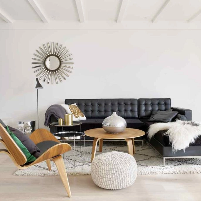 Zdarzały się i niespodzianki. Gdy przyjechała kanapa z internetowej aukcji, okazało się, że jej pokrycie jest mocno sfatygowane. Właścicielka wpadła na pomysł, by na siedzenia uszyć czarne welurowe pokrowce. Obok postawiła fotel Shell Wegner CH 07 i lampę Arne Jacobsena.