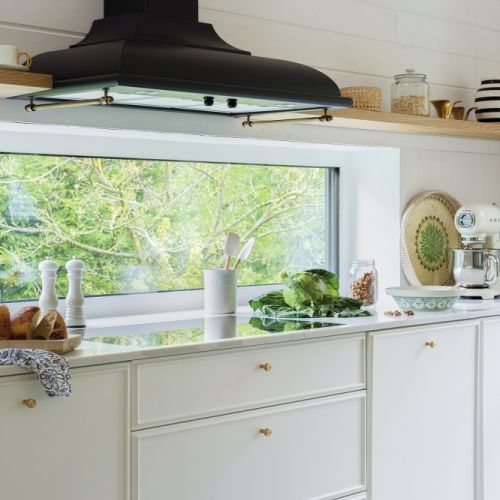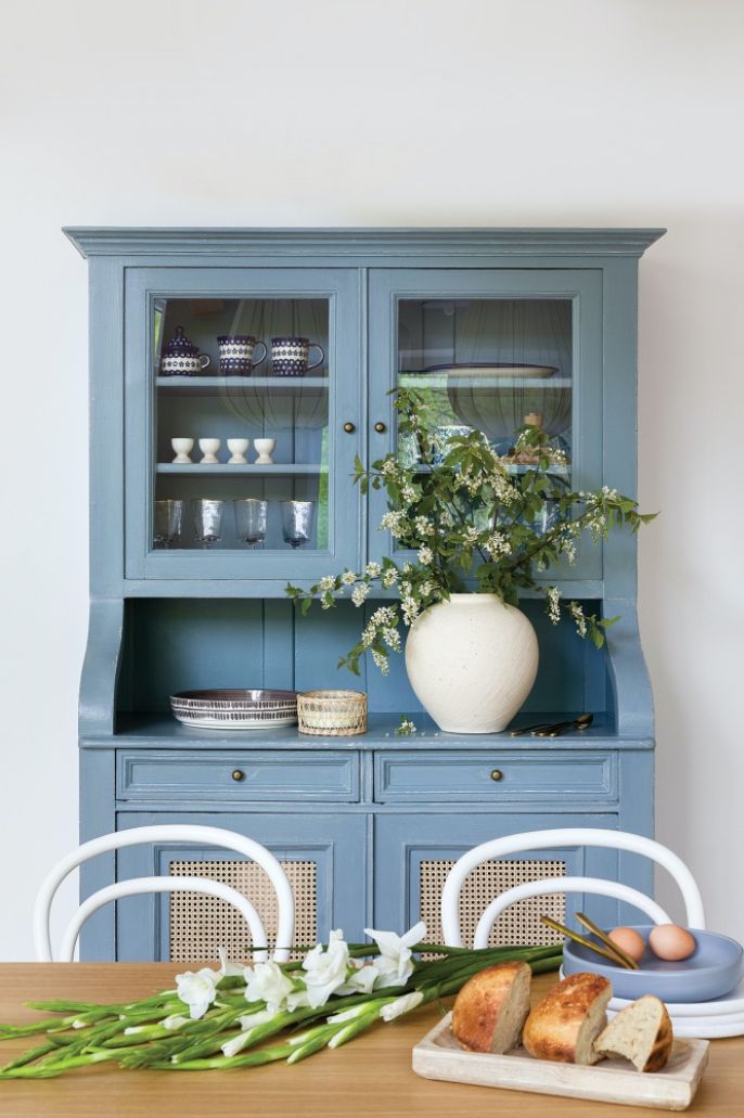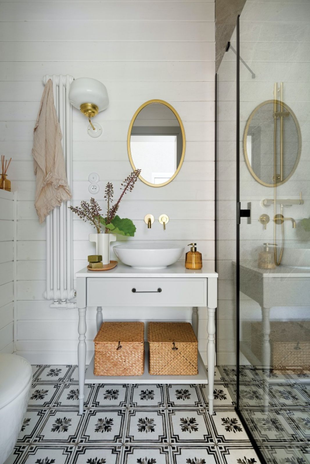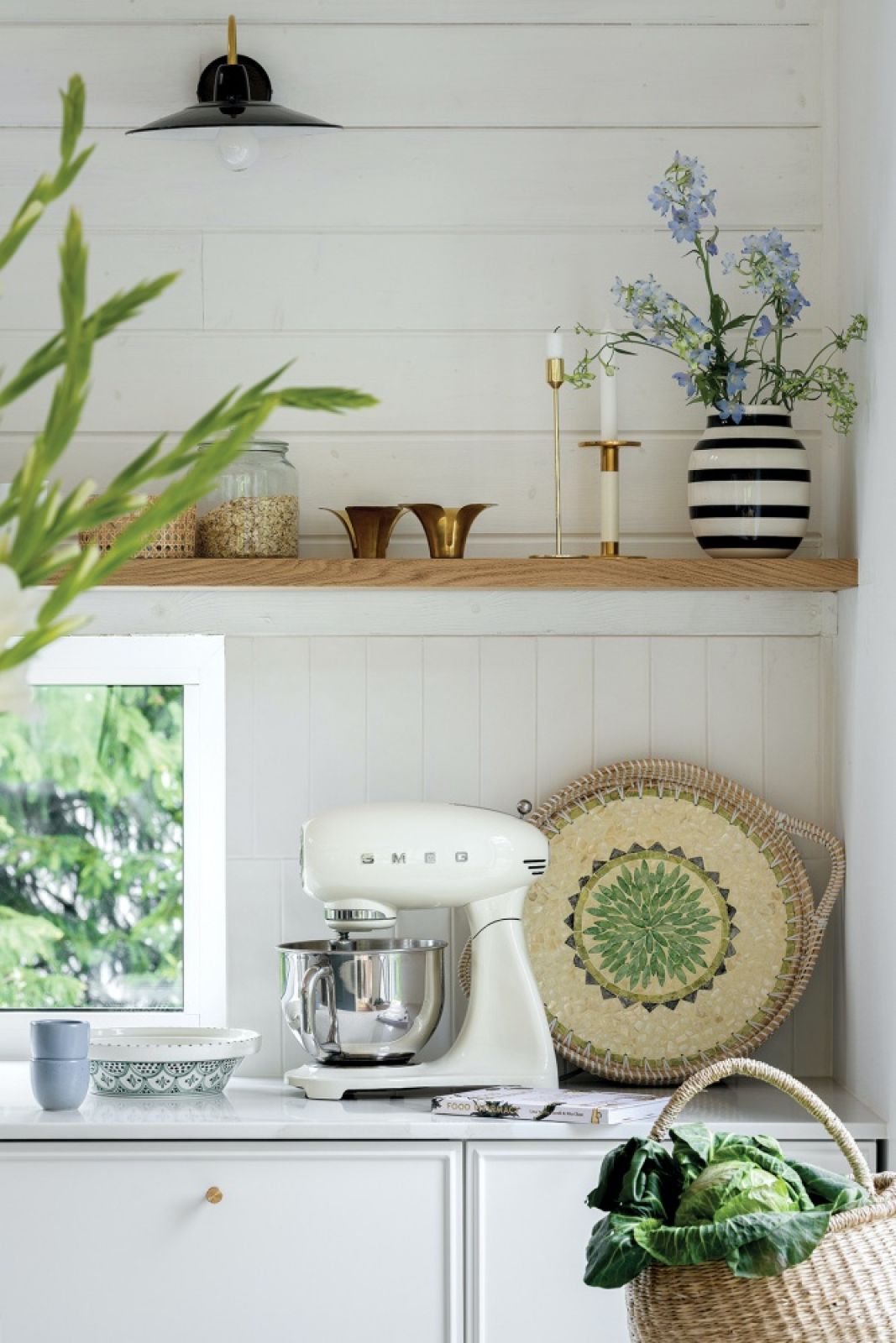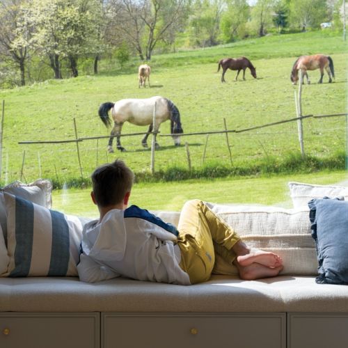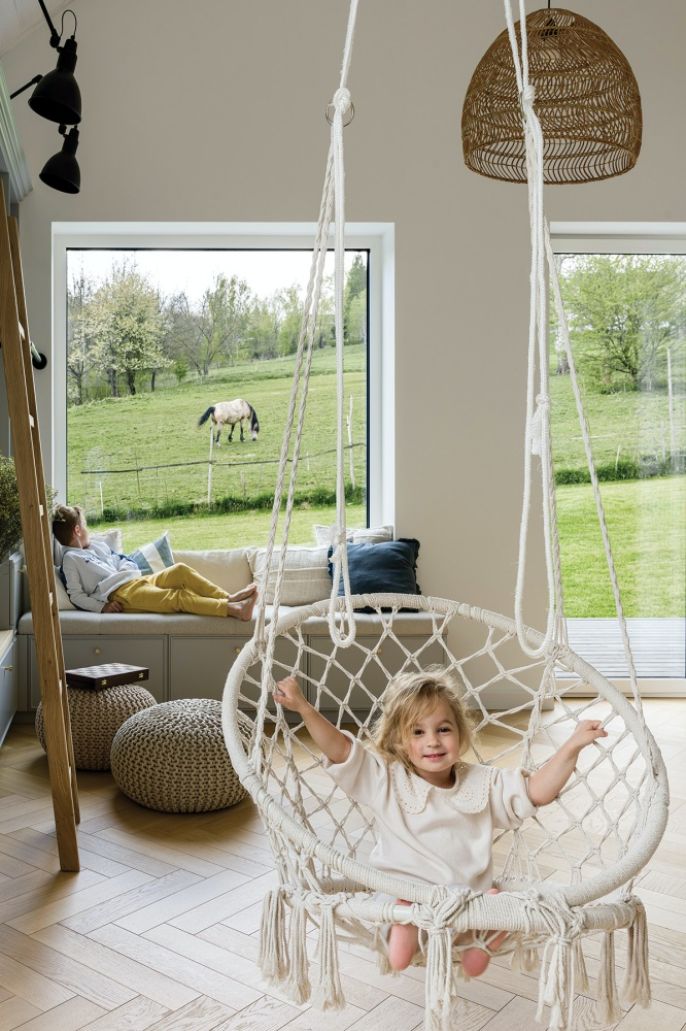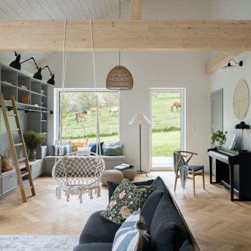 Centralnym punktem jest salon z dwiema sofami i widokiem na las. Dużo siedzisk znajduje się też przy oknach, aby wygodnie leżąc, można było obserwować świat na zewnątrz. Pojawiło się i kilka „sielsko-polskich akcentów”, jak meble polskich marek, odnowiona stuletnia komoda ze Śląska czy klasyczne drewniane drzwi. – To wakacyjno-weekendowy dom – podkreśla Katarzyna. – Gdy jemy śniadanie, za oknem konie sąsiadów niemal zaglądają nam w talerze – śmieje się.