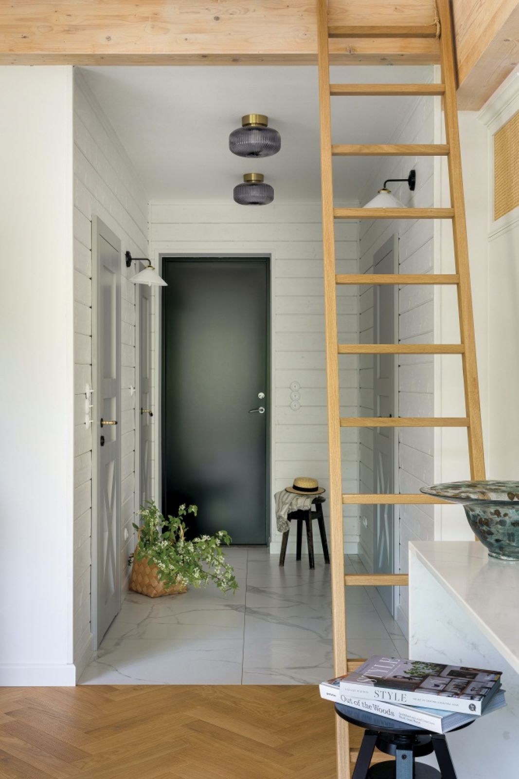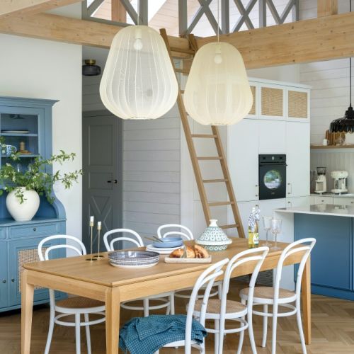 Przestrzeń została podzielona na część wspólną: kuchnię, salon, bibliotekę i dalej dwa pokoje dziecięce z antresolami, sypialnię, pokój gościnny i dwie łazienki. Wystrój też miał odzwierciedlać skandynawską prostotę i tym tropem poszła Agnieszka Cygańczuk ze studia Illa Design, która zaprojektowała wnętrza. Ważne były kolory i materiały – drewno, biele, szarości, akcenty niebieskiego. Pobielono belki stropowe, by nie wyglądały na masywne. Lekkości wnętrzu nadaje także… brak schodów – na antresolę nad kuchnią wchodzi się po drabinie.