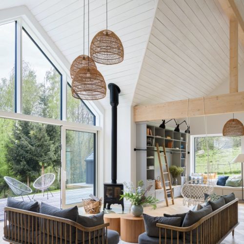 Działkę kupił tata gospodyni jeszcze przed jej narodzinami. Była w pobliżu ich rodzinnego domu – najpierw zalesiali to gołe pole, potem wykopali także staw. Dla Katarzyny to miejsce wiązało się z ciągle żywymi wspomnieniami z dzieciństwa. Wróciły, gdy pandemiczne lockdowny pozamykały wszystkich w czterech ścianach. Od wielu lat dojrzewał w niej pomysł, by się tu pobudować, rozmyślała nad projektem i wystrojem wnętrza.