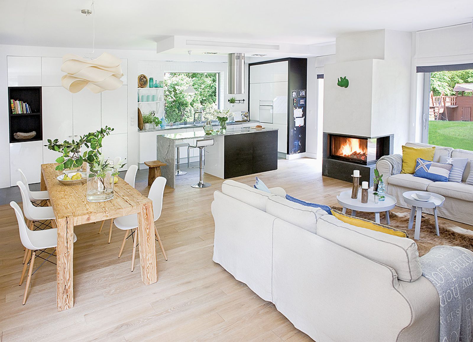 Karinie ta surowość bardzo pasuje, domowi także. Na piętrze ściany wyłożyła prostymi białymi deskami, do salonu wstawiła stół z olbrzymich sosnowych bali z odzysku. Były kiedyś częścią stodoły. – Miała chyba z dwieście lat. Znalazłam na Mazurach firmę Regalia, która z takich sękatych dech robi nowoczesne rzeczy – opowiada. – To był nasz pierwszy mebel. Od razu wyobraziłam go sobie w otoczeniu nowoczesnych krzeseł Eamesów. Nad stołem niezwykła lampa LINK. Tym razem nie skandynawska, lecz od hiszpańskiej firmy LZF, która skręca w dziwaczne konstrukcje wycięte z drewna szerokie wstęgi fornirów. Chropowatym kamieniem wyłożony jest kominek w salonie (ekipa bardzo się dziwiła, że ma zostać taki, a nie wypolerowany jak lustro).