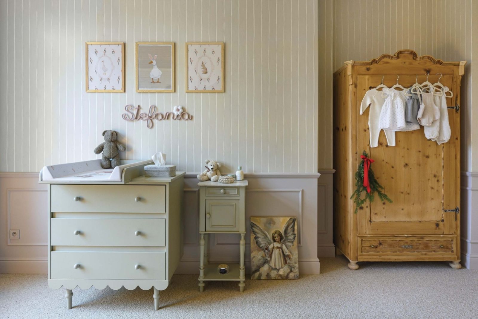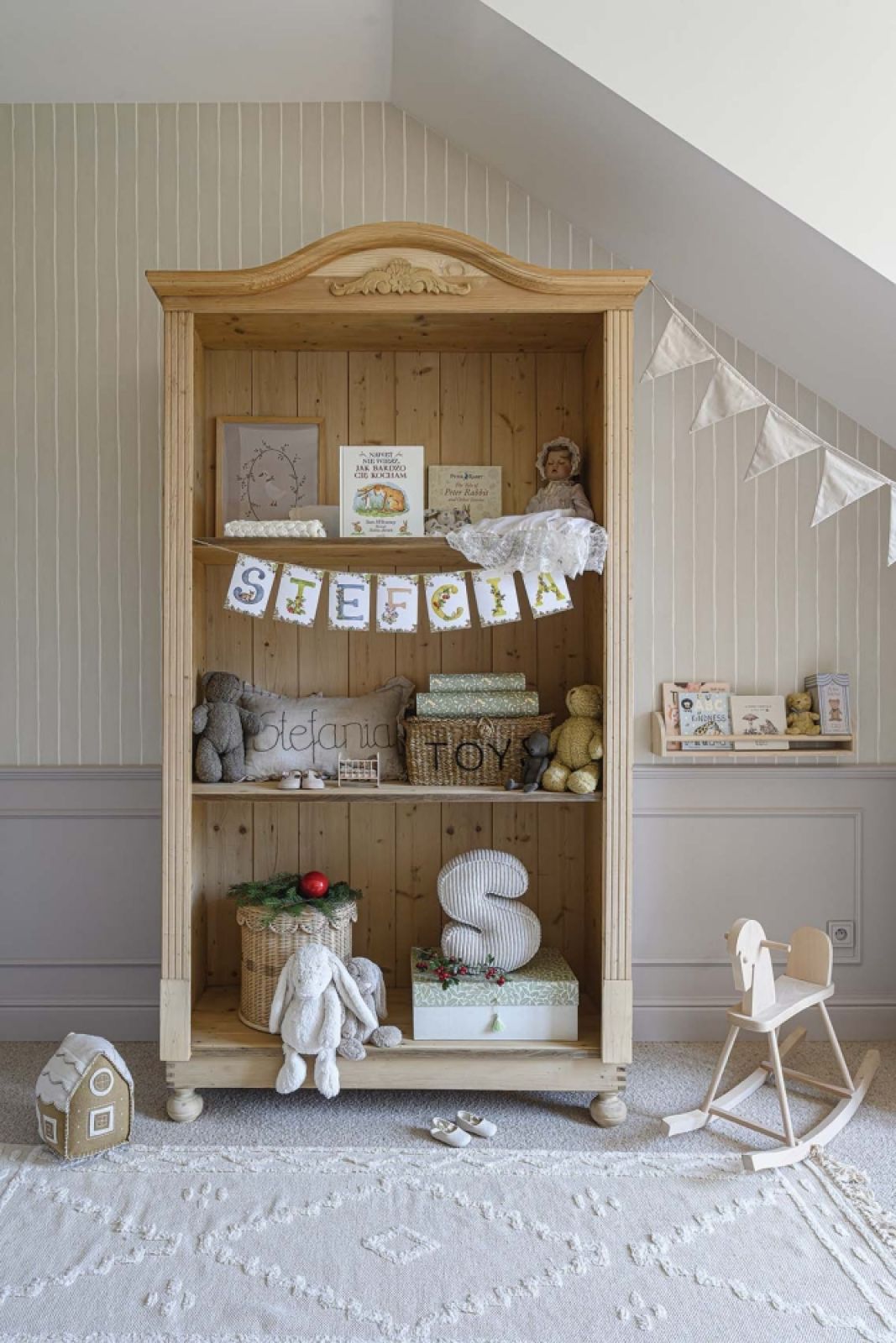 Estetykę wyspiarską czuć najwyraźniej na piętrze – w sypialniach są tapety na ścianach, w pokoju dziecka – stylowa boazeria, a wszędzie na podłogach króluje miękka wykładzina. Każdy, kto bywał w niedogrzanych wiktoriańskich domach, wie, jak ważne są takie ocieplacze.
