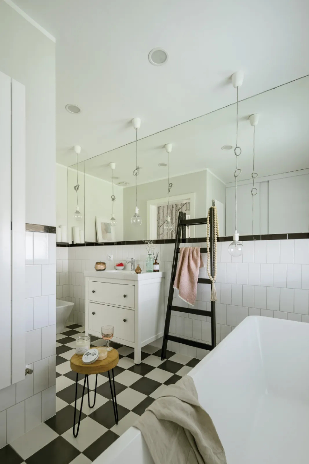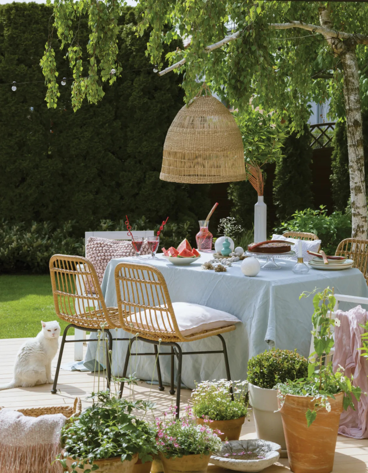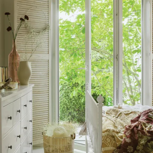 Właścicielka pomysłowo zmieniła też sypialnię. Nie tylko przemalowała ściany, ale na jednej przykleiła sosnowe deski i pobieliła je specjalną farbą. Do tego dobrała podobnie wykończone shuttersy zrobione z lamelkowych frontów kupionych w markecie budowlanym. Nad łóżkiem powiesiła świetlną girlandę. Dom nabrał lekkiego, wakacyjnego charakteru. To wrażenie potęguje jeszcze duży taras z podłogą z desek, który latem staje się przedłużeniem salonu. Stanął tam spory stół, gdzie w ciepłe dni rodzina przesiaduje sama albo w towarzystwie gości. A nad nim zawisł na brzozie… żyrandol.