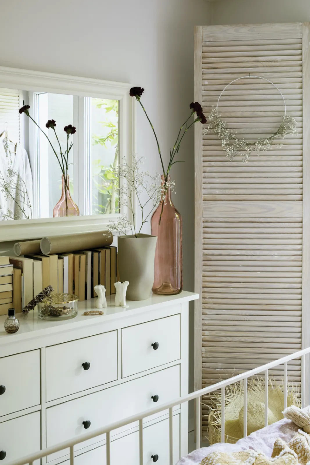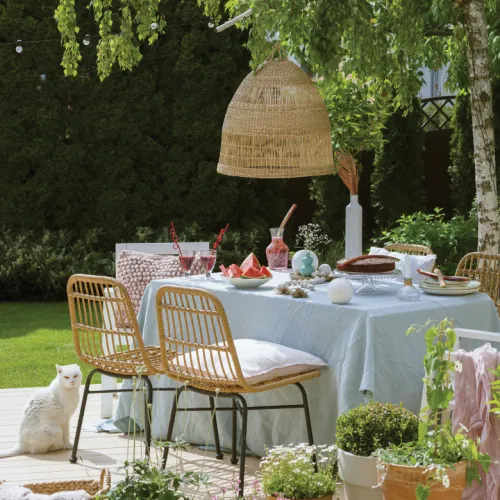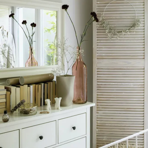 – Od tego czasu większych zmian nie było, bo świetnie nam się tutaj mieszka – mówi właścicielka. – Tylko wraz z porami roku zmieniam kolory dodatków. Latem jest najbardziej barwnie, królują róże, a ostatnio pastelowy niebieski, jesienią rudości, zimą chłodne barwy. Lubię, kiedy wnętrze dopasowuje się do natury, do tego, co za oknem, bo wtedy mam poczucie harmonii i spokoju, który udziela się nam i każdemu, kto nas odwiedza. Z takiego domu nie chce się nigdzie wychodzić.