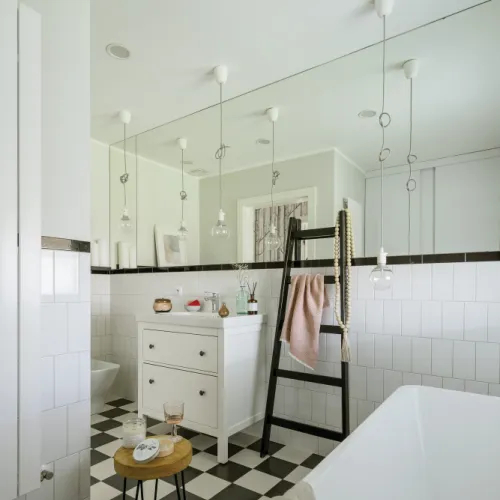 Asia starała się nie wyrzucać starych rzeczy i nie kupować zbyt wielu nowych – pod kolor zmieniła więc obicia kanapom – tym z IKEA, które mają od początku. Odmalowała komodę, która stoi w salonie i odświeżyła lustro nad nią. Nie chciała przytłaczać wnętrza meblami. Dokupiła jeszcze tylko ulubiony fotel z plecionym oparciem, kultowe plastikowe krzesła Kartell do jadalni, komody w stylu skandynawskim i tapetę we wzór pni brzóz z Cole & Son. – To moje ukochane drzewa, więc kiedy ją zobaczyłam, od razu mnie urzekła – mówi Asia. – Latem dodaje nutkę chłodu, zimą pięknie pasuje do ogrodu. I do brzozy, którą obudowaliśmy tarasem.