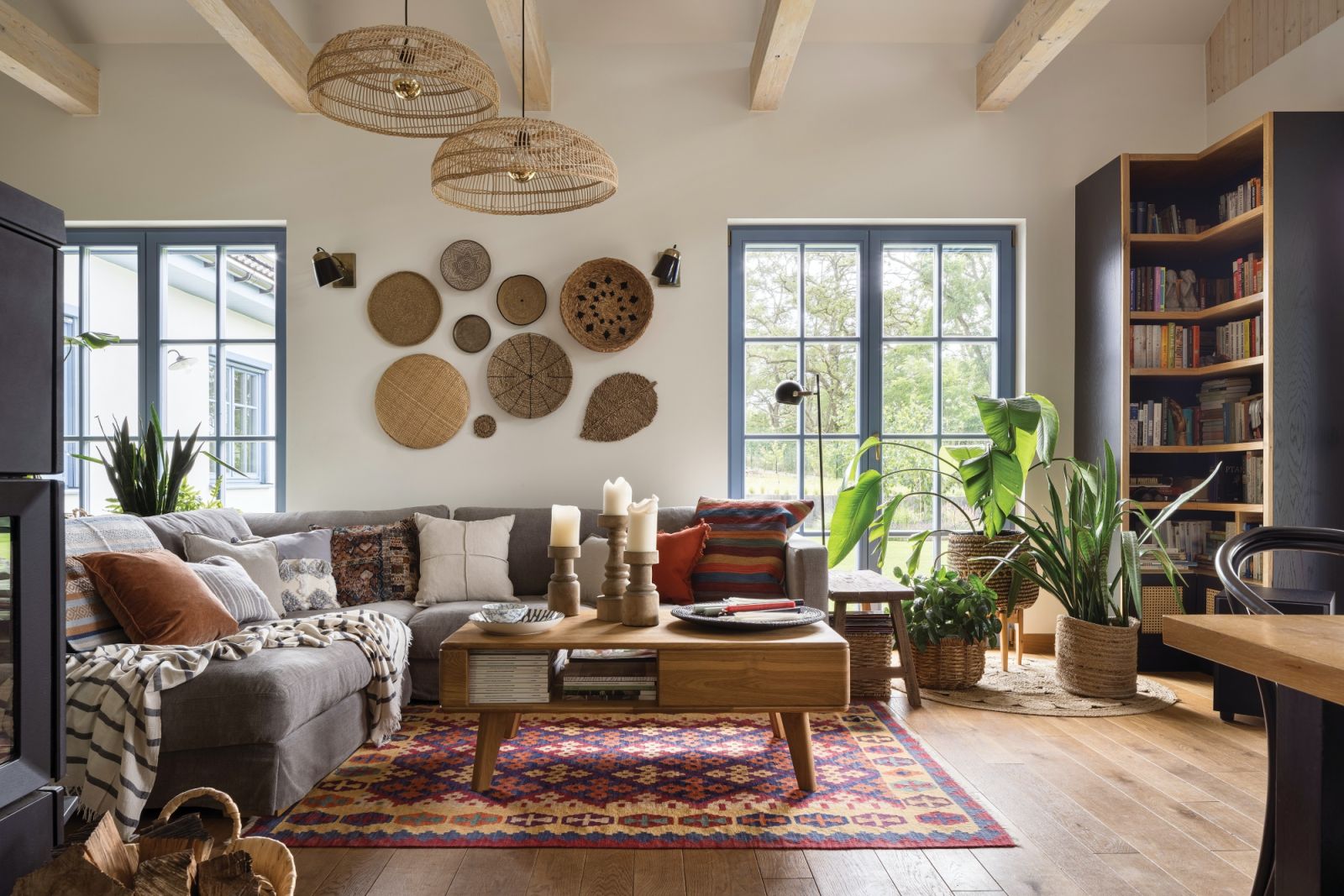 Styl skandynawskiTen dom miał być wspomnieniem z dzieciństwa, które Joanna spędziła w Skandynawii. Bielony, z kolorowymi oknami i przytulnymi wnętrzami pełnymi drewna, plecionek oraz rodzinnych pamiątek.