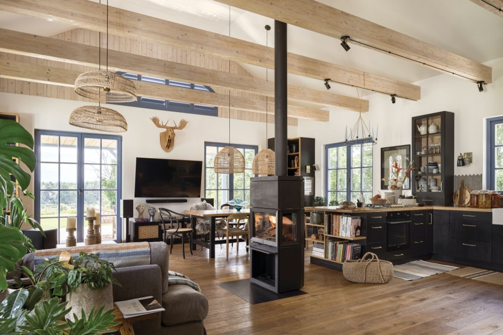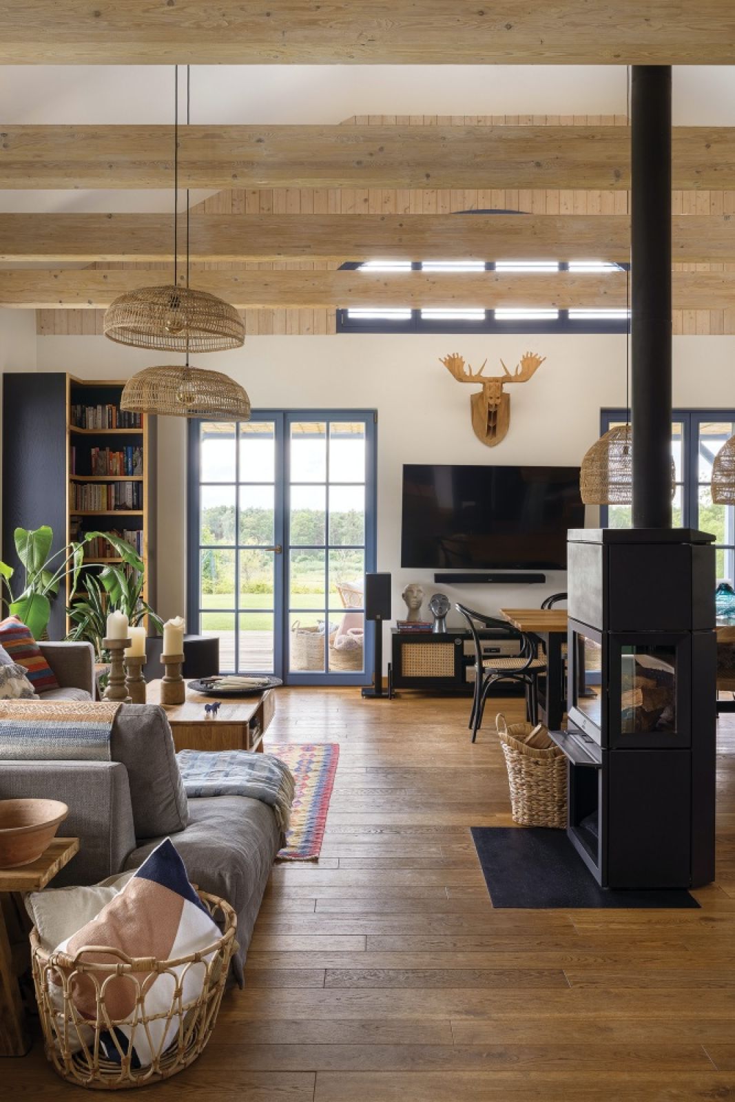 Nasz dom miał być parterowy, bo nie chcieliśmy biegać po schodach tam i z powrotem, ale za to bardzo wysoki. W najwyższym miejscu części wspólnej ma aż 5,5 metra. Naprawdę czuć tutaj przestrzeń! Marzyliśmy o elewacji z czarnych desek i białym obramowaniu okien, taką miała Anna Maria. Ale nie znaliśmy wtedy jeszcze japońskiej techniki opalania drewna, która daje bardzo trwałe efekty i baliśmy się kosztów związanych z częstym malowaniem.