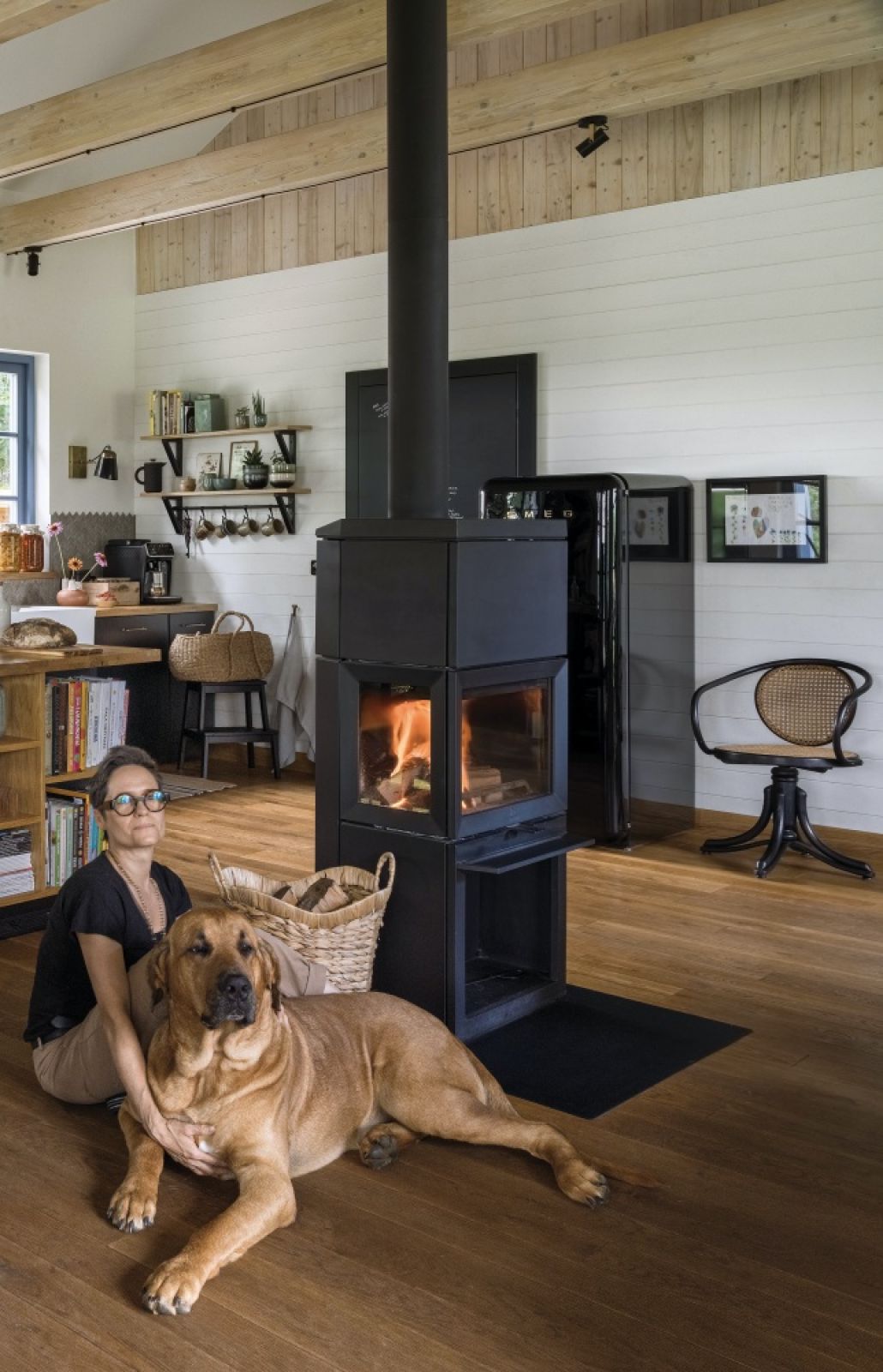 Wybraliśmy typ szwedzkiego domu popularny na południu tego kraju – bielony wapnem, z charakterystycznymi kolorowymi oknami podzielonymi szprosami. Nasze okna miały być niebieskie. A budynek w skandynawskiej technologii – dobrze izolowany i oddychający. Szczęśliwie trafiliśmy na firmę Tektum spod Wrocławia, która od kilkunastu lat stawiała takie domy w Szwecji i Norwegii. Wybudowali go w trzy miesiące, z prefabrykatów. Zainstalowali nam też ogrzewanie infrared. To maty na podczerwień montowane na suficie i zasilane panelami fotowoltaicznymi – okazały się wydajne i oszczędne. Szczególnie w połączeniu ze skandynawską kozą, która stoi w samym centrum wspólnej przestrzeni. W zimie to ona głównie nas ogrzewa.