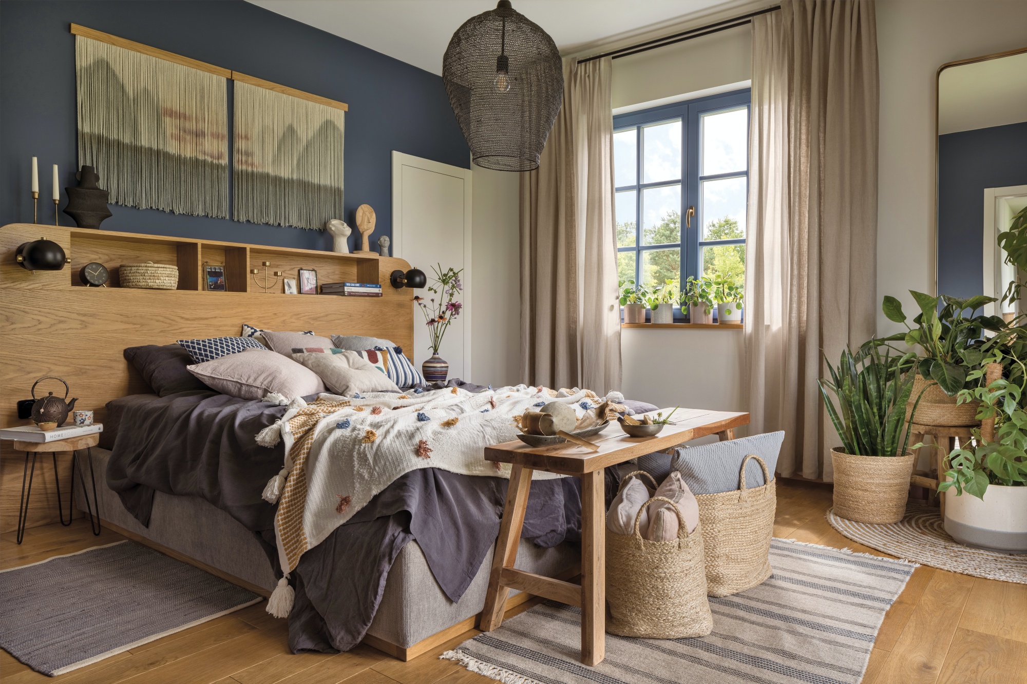 Sypialnia jest przytulna dzięki starannie wybranym dodatkom: sztuce, tkaninom, plecionkom i dużej ilości roślin. W oknach Joasia powiesiła lniane zasłony z małej polskiej manufaktury Il Letto (illetto.com).