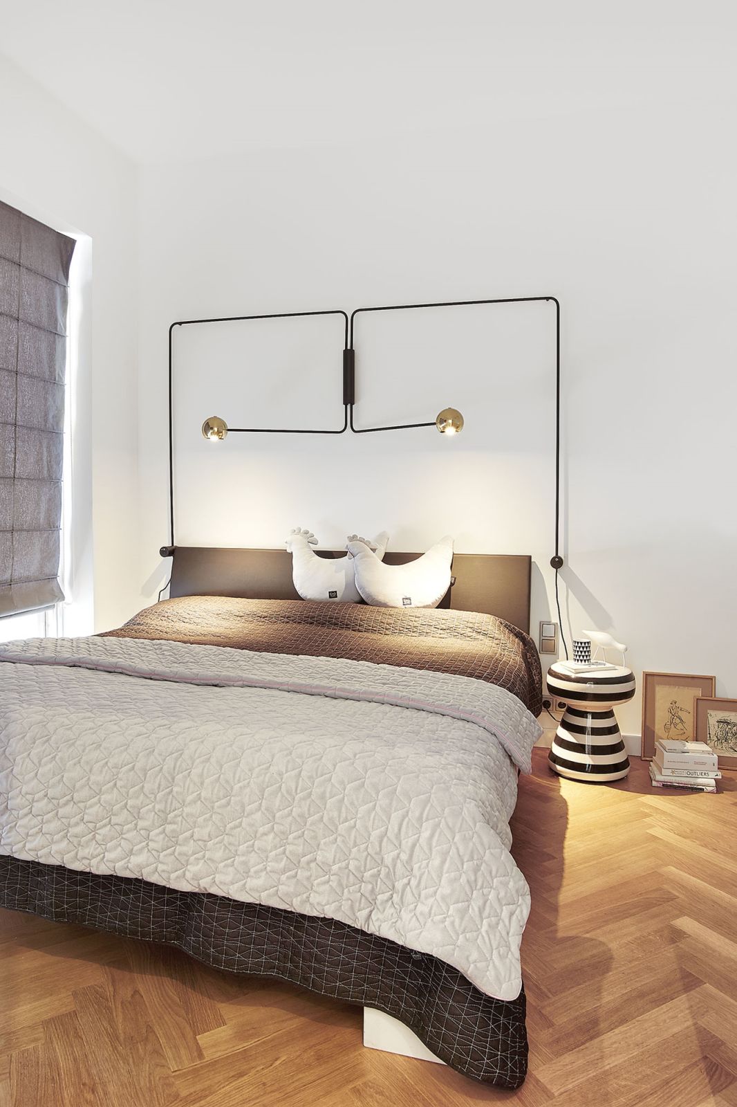 Cementowe płytki na posadzkach to polska Purpura, dębowe podłogi – Baranowscy Studio, ceramiczne kafle zaprojektował Maciej Zień dla Tubądzina, kapitalne lampy w sypialni i jadalni są dziełem Macieja Kossowskiego, architekta, który porzucił zawód, zajął się wymyślaniem dizajnerskiego oświetlenia i założył firmę ULTRAlight, rolety uszyła firma Dekoria.