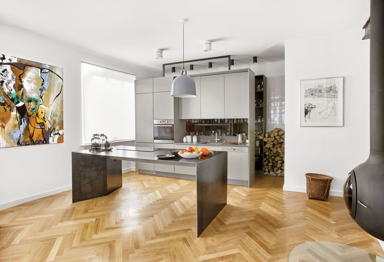 Do Przemka Lisieckiego dołączyli artyści: rzeźbiarz Tomasz Kochman, który wyrzeźbił z drewna schody przypominające szeroką białą wstęgę, i Tomasz Stankiewicz, ślusarz (ale z duszą artysty), autor subtelnej, lecz bardzo wytrzymałej metalowej wyspy kuchennej. – Spędzam przy niej z synami sporo czasu – mówi dziennikarka.