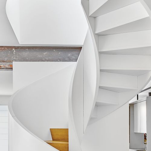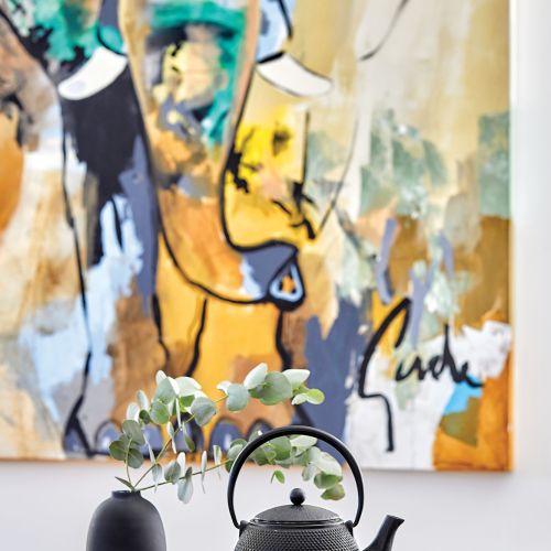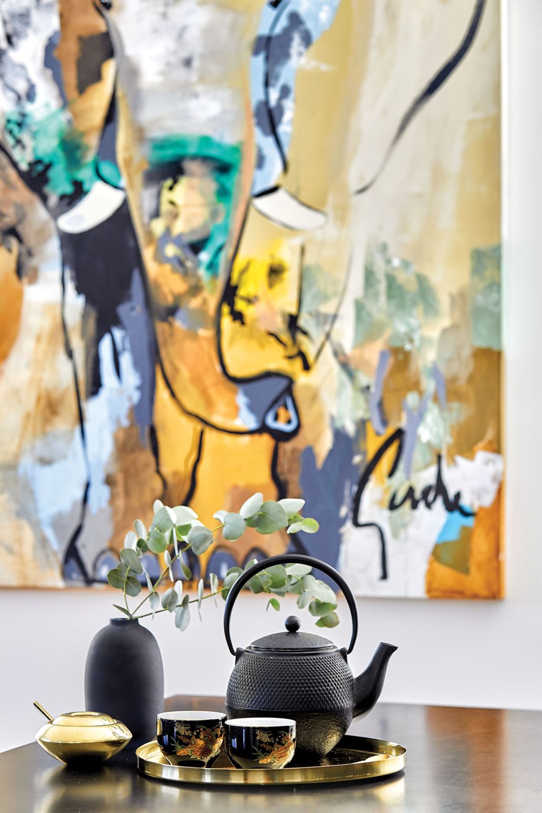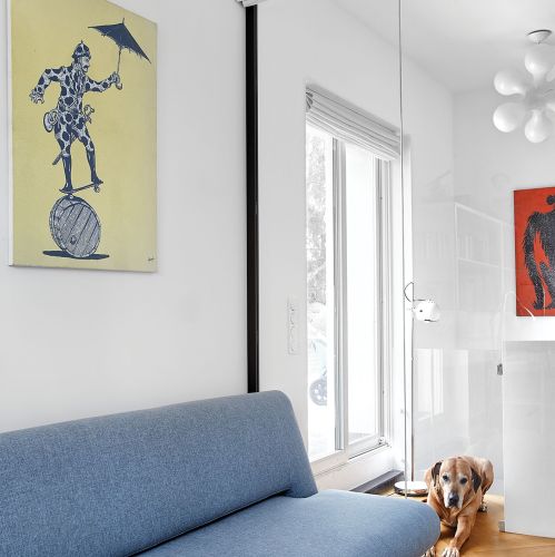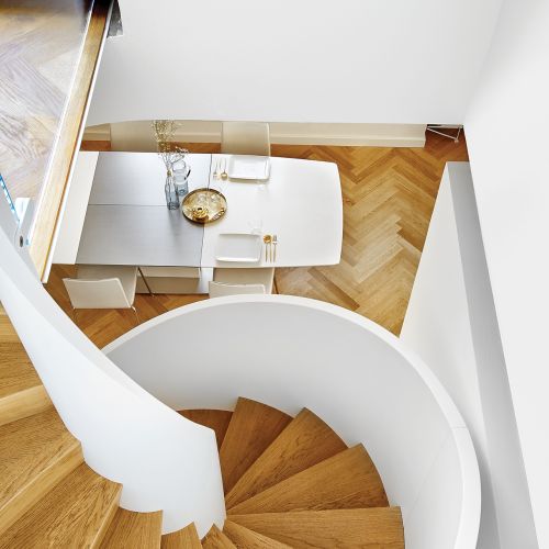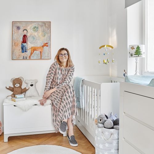 O pomoc poprosiła przyjaciela z dzieciństwa, architekta Przemysława Lisieckiego. – Nie padło wtedy słowo „minimalizm” – wspomina. – Oboje mówili, że potrzebują światła, powietrza, metamorfozy. Zaprojektowałem więc otwarte, ażurowe wnętrze, nowoczesne, ale nawiązujące do przedwojennej architektury Saskiej Kępy. Z dębową francuską jodłą na podłodze (podobną mają w swojej kamienicy rodzice Pawła), cementowymi posadzkami Purpury na tarasie i balkonie i modernistycznymi schodami, dla których inspiracją była jedna z pobliskich kamienic. Wcześniej schody też tu były, ale wciśnięte między tapety i karton-gipsy. Teraz wszystko kręci się wokół nich. Niektóre ściany projektowałem specjalnie pod obrazy – jasne i puste, bo wiedziałem, że zawiśnie tam kolorowy słoń czy grafiki przedstawiające konie z Janowa Podlaskiego.