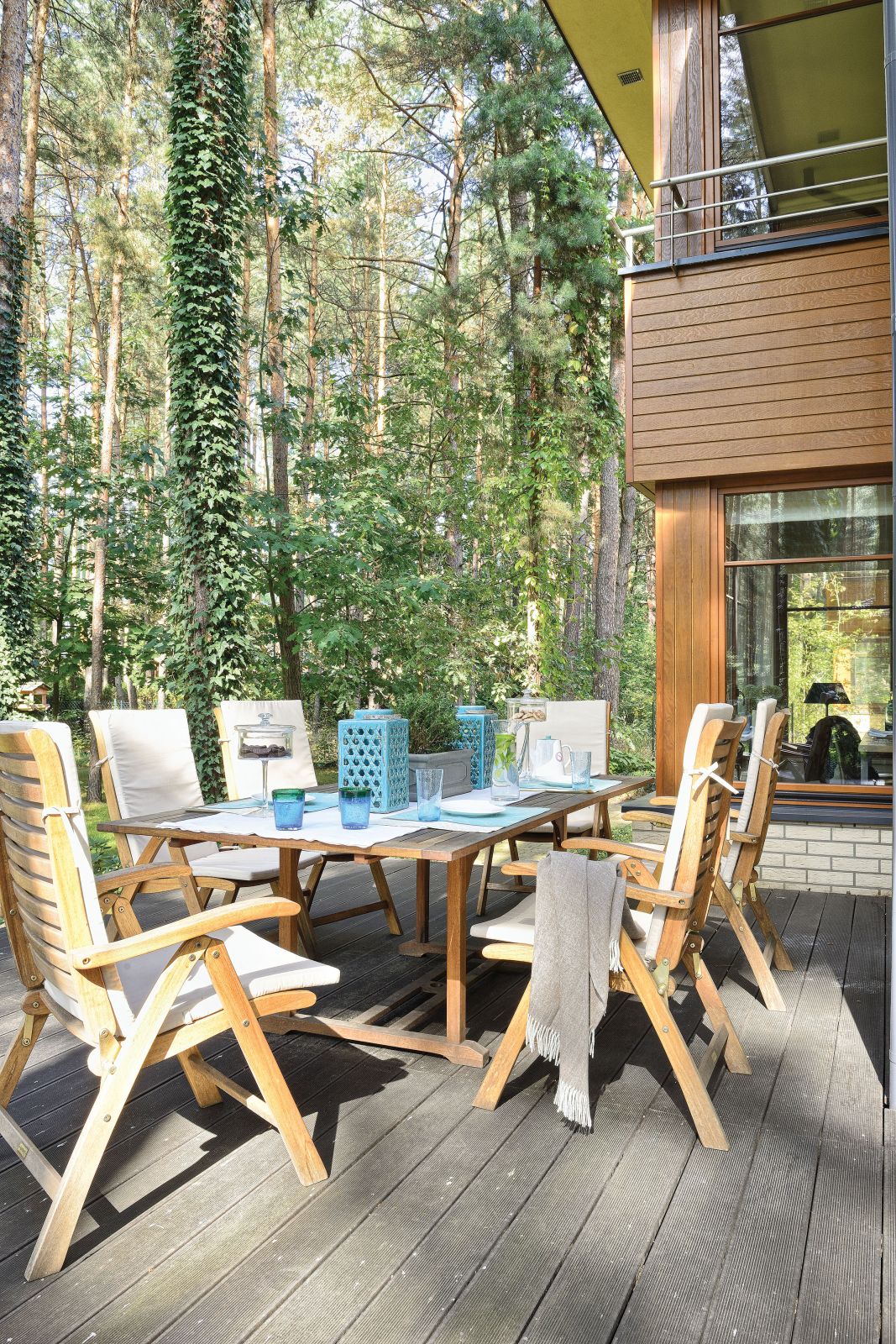 Chociaż dom jest gęsto otoczony drzewami, ma magiczne światło. Dzięki sosnom, które do późnego wieczora odbijają słońce.