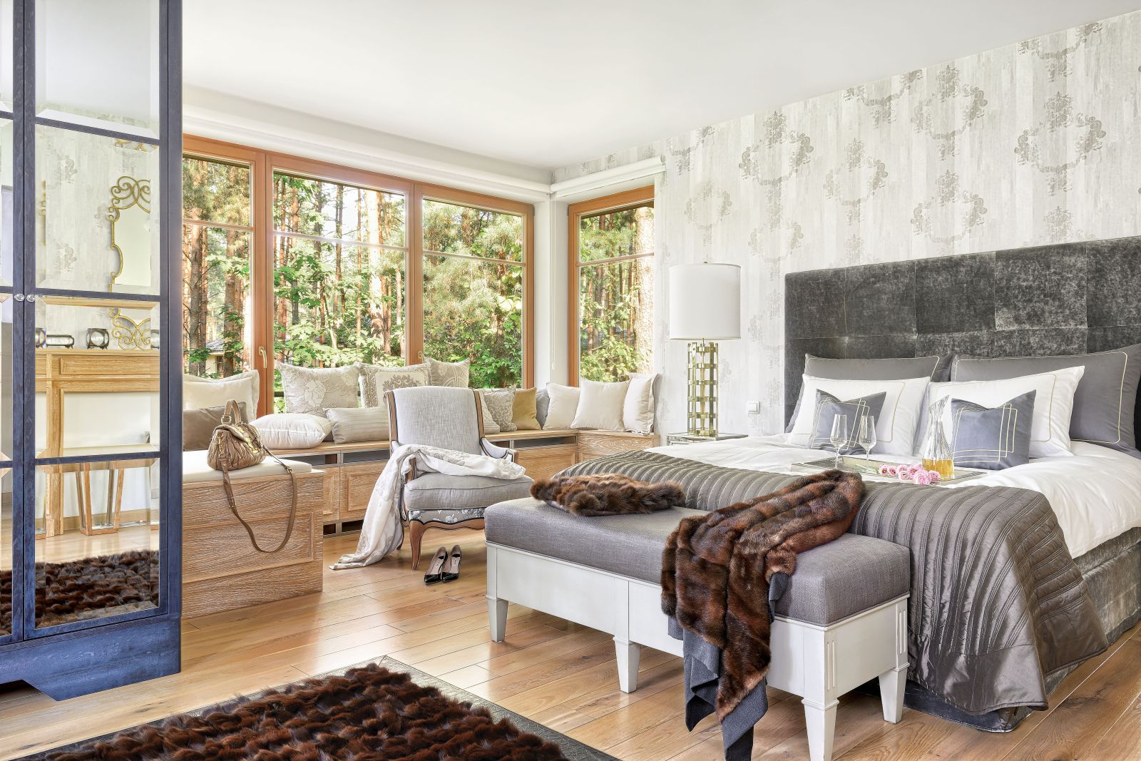 Na piętrze skorzystali z pomocy projektantek z InsideArch. Cała sypialnia była urządzana pod łóżko à la Hästens, z delikatną domieszką glamour. Świetnie zaaranżowane okna zastępują fotele do czytania i szezlong do leniuchowania, obudowane szafkami z poduchami. Lampę Lazy Susan Ewa ściągnęła ze Stanów, z żarówkami edisonowskimi, o których u nas było jeszcze cicho. Mąż był zły, bo potrzebowała innego napięcia prądu, ale wygląda super.