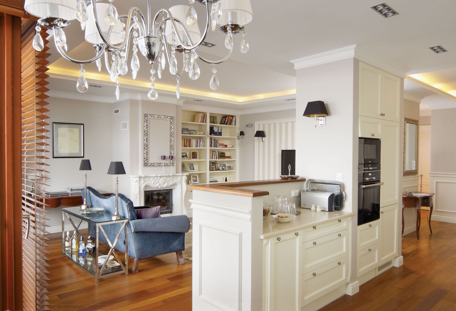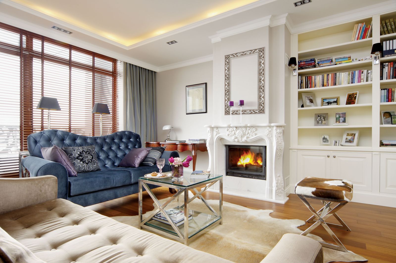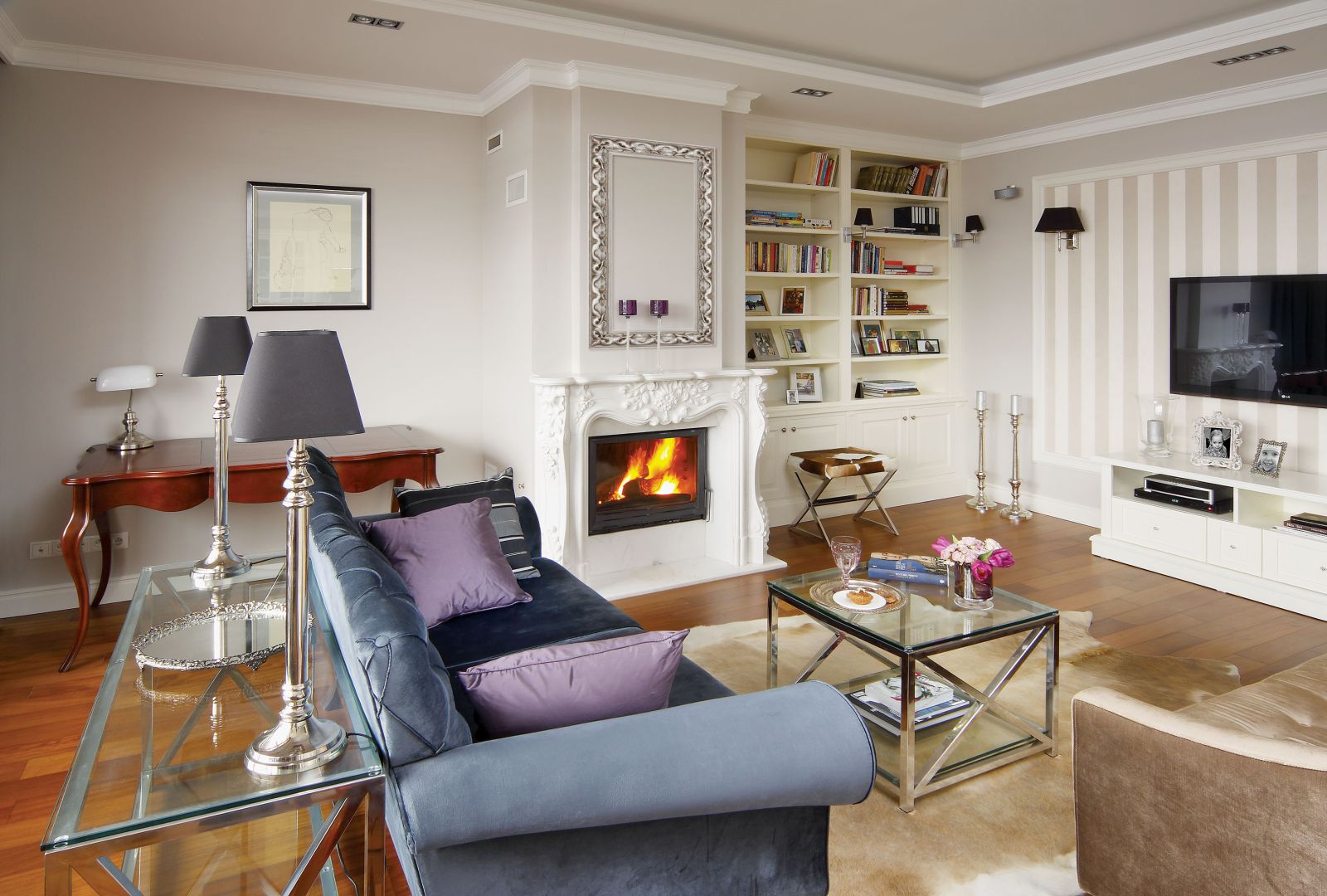 Wnętrze miało być ciepłe, lekko klasyczne, kobiece. Kasia zaproponowała stylizowane sofy, bibliotekę i kuchnię w stylu angielskim. Maria nie byłaby sobą, gdyby nie dorzuciła szklano-stalowego stolika, konsoli i nieco koloru.