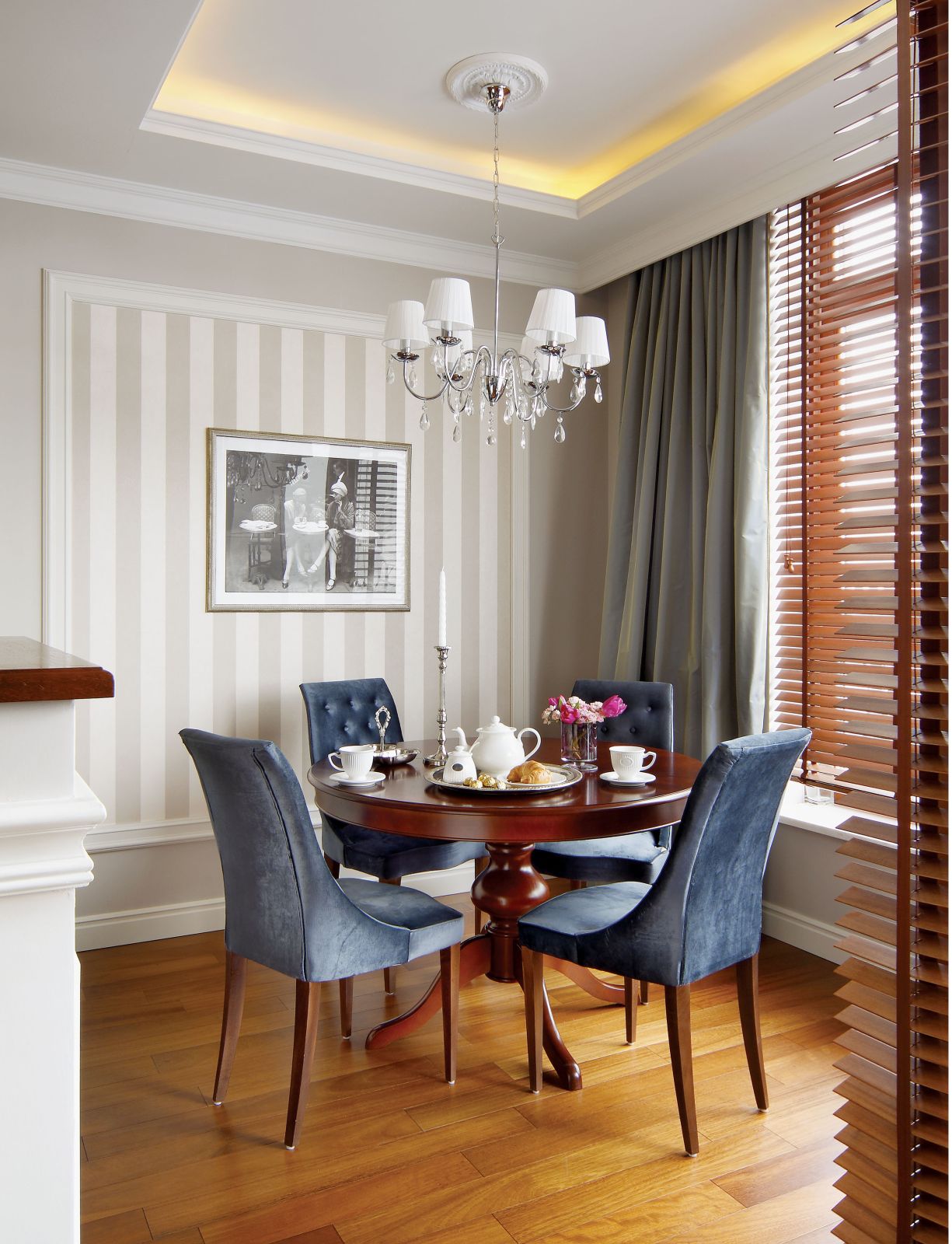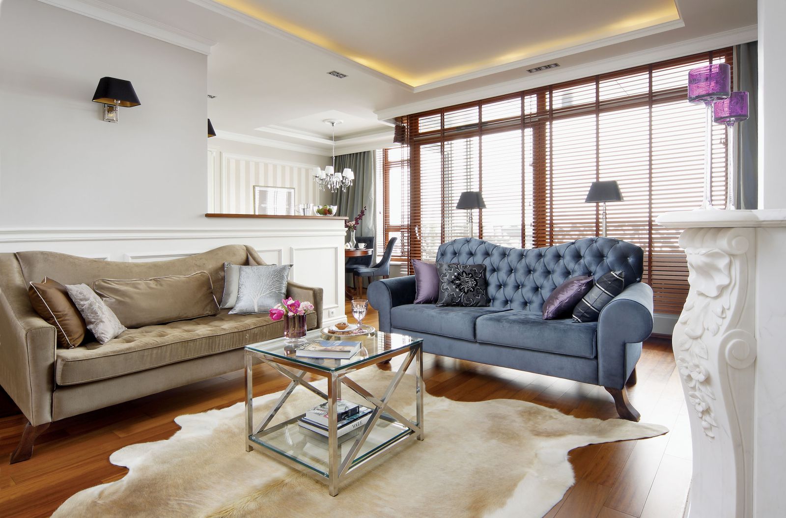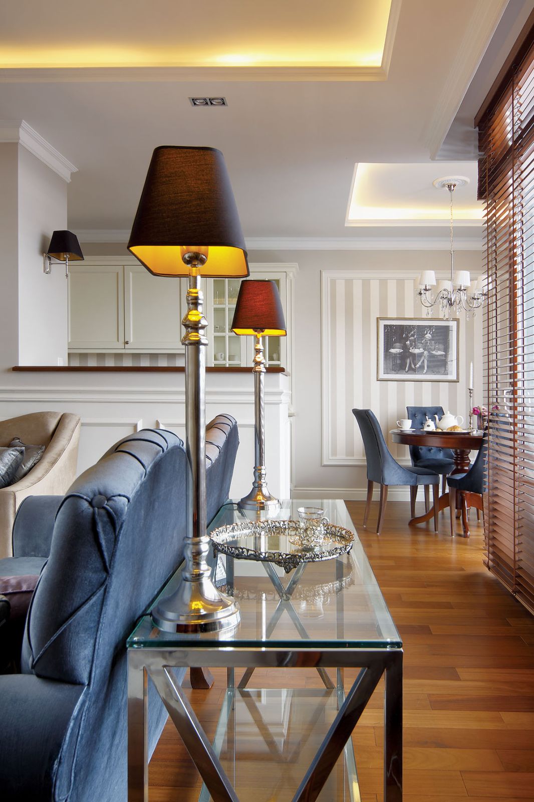 Do szarości i złamanych bieli, które wymyśliła projektantka, pasowały jej zgaszone błękity. Strzałem w dziesiątkę według pani domu były też sztukaterie – kiedyś się ich trochę bała, uważała, że są za ciężkie.