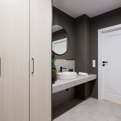 Z kolei druga łazienka jest dostępna zarówno dla domowników, jak i gości. Tu także postawiono na neutralne odcienie. Kolorystyczną bazą jest ciemny brąz rozświetlony jasnoszarymi płytkami. Ciemna armatura tworzy elegancki duet z białą ceramiką. Pełen komfort zapewnia przestronna kabina typu walk-in, a wysoka zabudowa skrywa mini pralnię, zapewniając miejsce na przechowywanie ręczników, detergentów i innych łazienkowych niezbędników.
