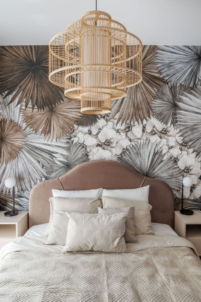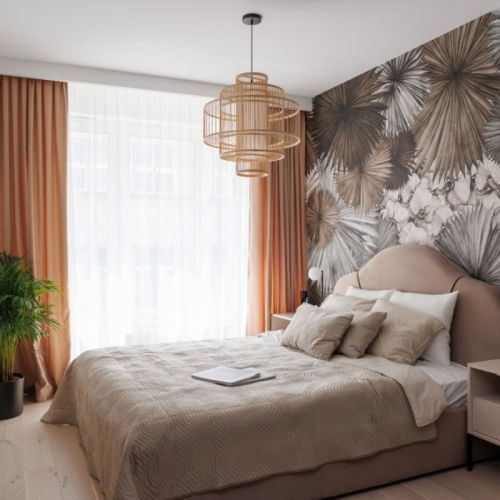 W ten sposób powstało okazałe wnętrze wypoczynkowe z prywatną łazienką i sporą garderobą. Dominują tu stonowane odcienie ziemi oraz naturalne materiały, sprzyjające wypoczynkowi. Dekoracyjnym elementem wyposażenia jest tapeta marki King Wall Gallery zdobiąca ścianę za wezgłowiem łóżka. Robiona na zamówienie zabudowa meblowa do garderoby gwarantuje sporo miejsca do przechowywania.