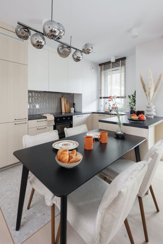 O funkcjonalnym charakterze przestrzeni przypomina jego klarowny podział na strefy użytkowe. Na granicy kuchni i salonu projektantka zaaranżowała jadalnię z prostym czarnym stołem. Dobrała do niego lekkie i wygodne krzesła z charakterystycznymi obiciami z naturalnej tkaniny. Praktycznie urządzona kuchnia w kształcie litery U wizualnie domyka przestrzeń. Jest w niej dużo miejsca do przechowywania oraz do pracy – strefę roboczą wieńczy efektowny, kamienny blat. Fronty szafek z jasnym drewnopodobnym dekorem nawiązującym do stylistyki scandi, ładnie komponują się z oryginalnymi płytkami na ścianie. To miejsce stworzone do rozwijania kulinarnych pasji.