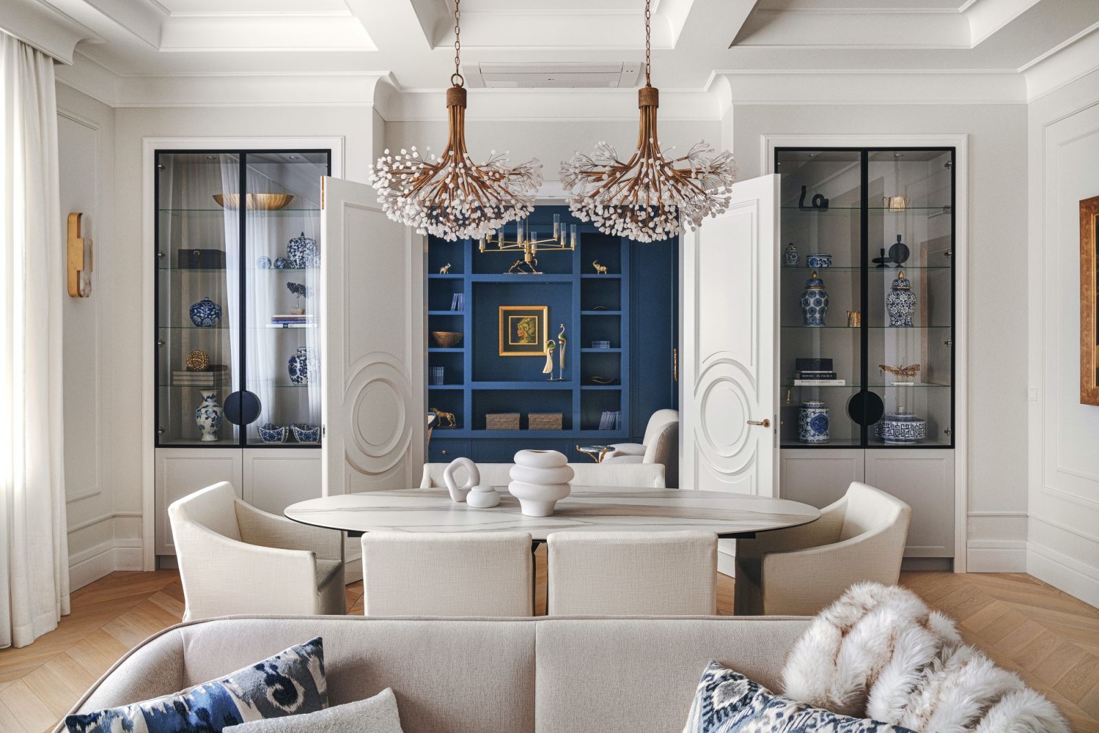 Spektakularny jest także jej błękitny home office – bardziej kojarzy się z eleganckim salonem niż przestrzenią do pracy, a do tego kontrastuje z utrzymaną w jasnych kolorach resztą apartamentu. To pomieszczenie pełni też funkcję telewizyjnego salonu – telewizor został schowany za rozsuwanymi drzwiami.