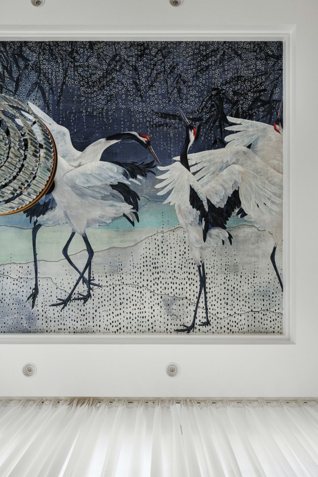 – Jagoda chciała, by te jej wymarzone wysokie sufity były też zaskakujące, urozmaicone. Powiedziała mi: – Możesz z nimi szaleć. Dlatego np. w pokoju do pracy mamy przyklejone lustra, w atelier zaproponowałam tapetę z czaplami, a w sypialni głównej sufit jest rozrzeźbiony belkami, które tworzą kasetonowy układ. Robią niezwykłe wrażenie.