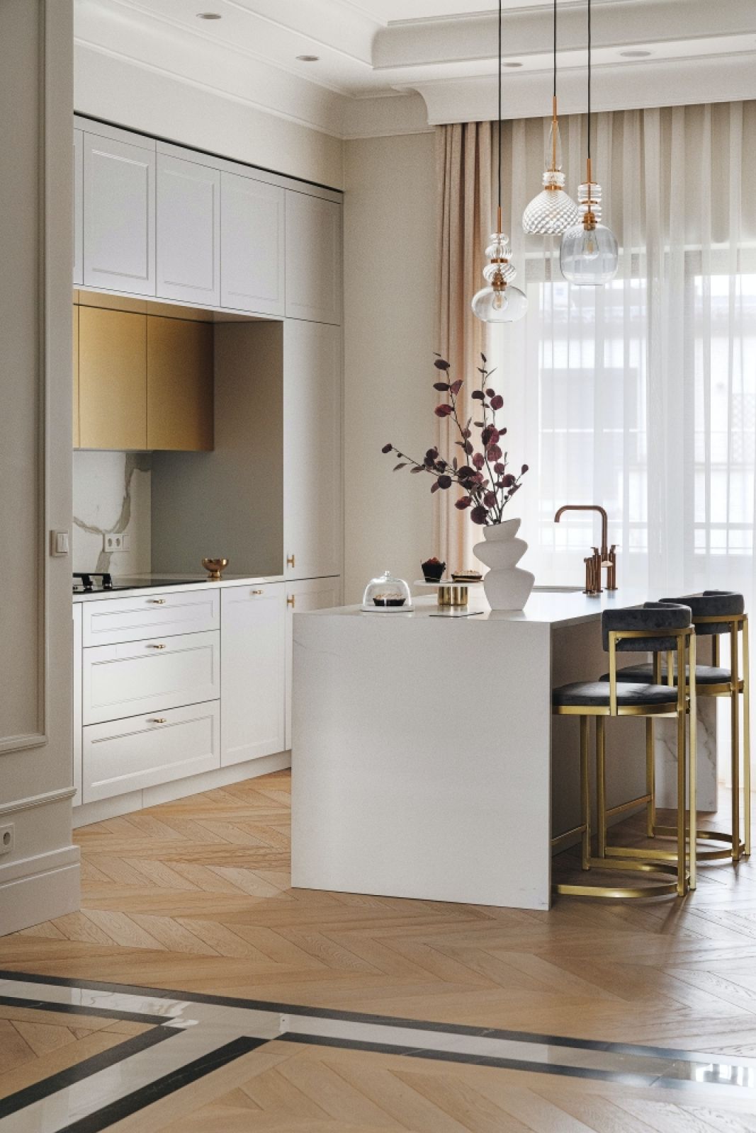 Styl francuskich kamienic był wyznacznikiem estetyki tego apartamentu. Jagoda marzyła o sztukateriach i sufitach, na których coś się dzieje. Akurat te ostatnie, z głębokimi kasetonowymi podziałami, bardziej przywołują amerykańskie rozwiązania, ale takie elementy jak dębowa podłoga ekskluzywnej marki Baront ułożona w jodełkę i wiele innych detali przywodzą na myśl paryski szyk.
