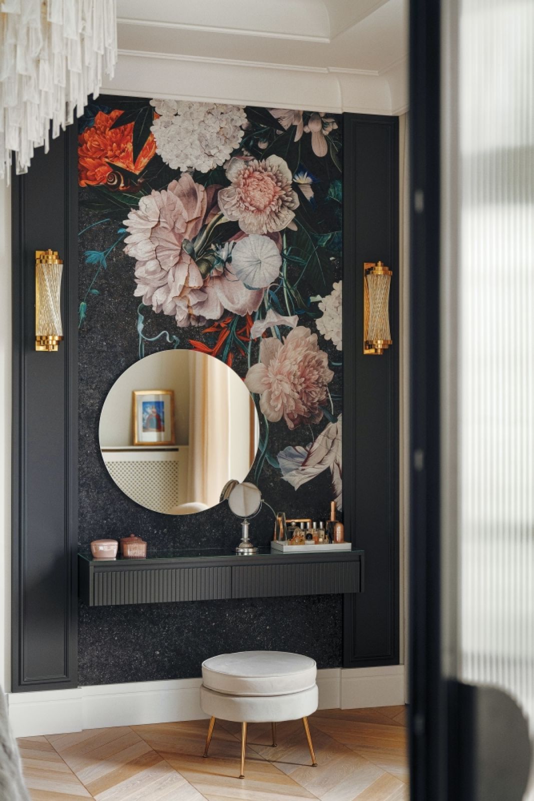 Szykowny azyl – elegancki i kobiecy apartament w stylu modern classic z tapetą na suficie