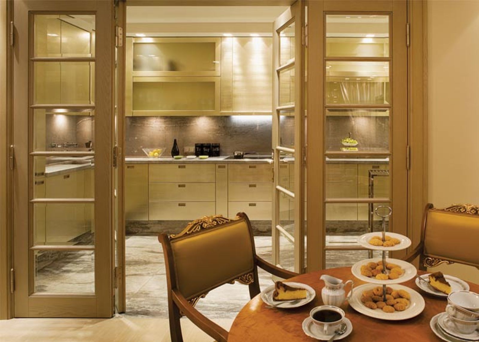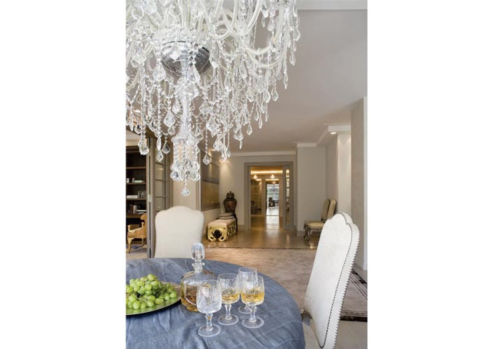 Ponieważ właściciele bywają w Warszawie przejazdem i jadają najczęściej na mieście, mimo że mieszkanie ma aż dwieście siedemdziesiąt metrów kwadratowych, kuchnia nie jest duża. Od salonu oddzielają ją ozdobne drzwi z kryształowymi szybkami.– Tutaj tylko parzy się kawę albo robi kanapki, a nie przygotowuje wystawne obiady – tłumaczy Marek Olko. Gdyby jednak właściciele mieli ochotę zrobić przyjęcie, nie byłoby z tym problemu – przy dużym dębowym stole z francuskiej manufaktury Moissonnier może zasiąść nawet dwanaście osób.