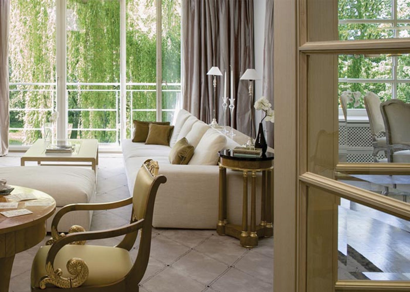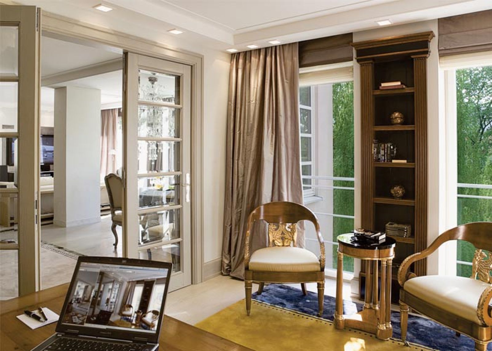 Biblioteka urządzona jest w stylu biedermeier. Marek Olko tak ją zaprojektował, by pasowała do kupionego wcześniej francuskiego biurka. Stolik z krzesełkami w stylu empire – dzieło włoskiej firmy Colombo Stile – to kopie kremlowskich mebli carskich.