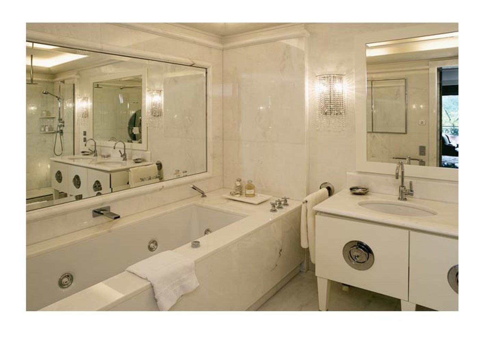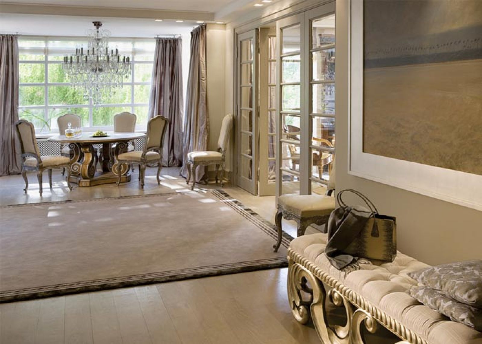 Już w holu bierzemy głęboki oddech. Zdobią go bogato rzeźbione lustro z konsolą wykonane w firmie artystycznej rodziny Chelini i prace Jerzego Nowosielskiego. To centralny punkt mieszkania – po lewej mamy jadalnię, kuchnię i salon. Z biblioteki możemy przejść do sypialni, a stamtąd, przez garderobę – z powrotem do holu. Po prawej stronie jest pokój synka, jego niani i łazienka. Do ekstrawaganckiej toalety dla gości trafimy także prosto z holu. Na tle ciemnego drewna, którym wyłożone są ściany, zawieszono złote chińskie płaskorzeźby. A za ukrytymi drzwiami schowana jest pralnia z prasowalnią.