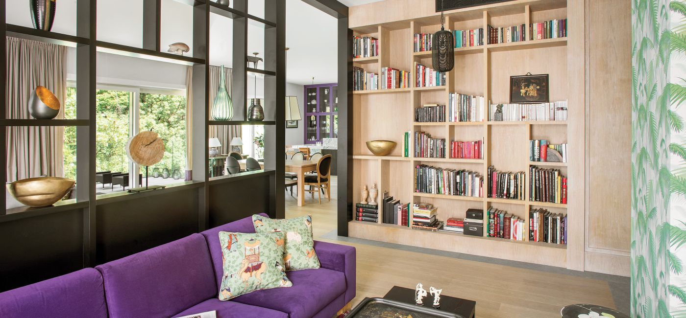W ogromnej części dziennej z połączonymi salonem, jadalnią i kuchnią znalazło się też miejsce na kącik kinowo-biblioteczny. – Elżbieta i Marek nie chcieli mieć telewizora w miejscu, gdzie spotykają się z rodziną i rozmawiają. Dlatego wpadłyśmy na pomysł, żeby go nieco odseparować. Stworzyłyśmy z Karoliną rodzaj drewnianej ażurowej przegrody. Dzięki temu do drugiego saloniku dociera światło. Poza tym można na niej ustawiać różne dekoracyjne przedmioty, które gospodarze zbierają, gros przywożąc z dalekich podróży – opowiada Małgorzata.