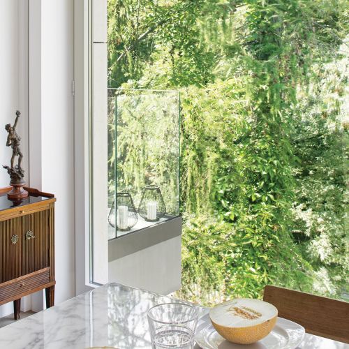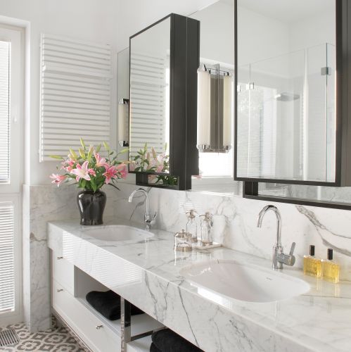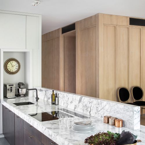 Z wielką pieczołowitością stworzono też kuchenną wyspę – idealnie licując płytę grzewczą z kamiennymi blatami. Od strony salonu zasłania ją niska ścianka z marmuru Statuarietto. – Marmur w kuchni to zawsze ryzykowne rozwiązanie. Kwaśne ciecze powodują, że matowieje. Rozlanie czerwonego wina może trwale go zaplamić. Na szczęście zabezpieczyłyśmy kamień specjalną przezroczystą żywicą – opowiada Małgorzata. Takie też są światowe trendy. Marmury, zwłaszcza z Carrary, są dziś hot!