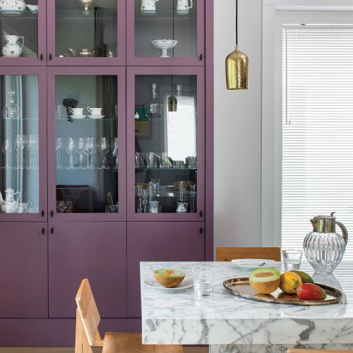 Duża część wyposażenia to meble robione na zamówienie według projektu architektek. – Lubimy coś „uszyć” na miarę. Tak było z fioletowym kredensem w kuchni. Gotowiec nie wyglądałby tak pięknie. A kolekcję porcelany gospodarzy trzeba było dobrze wyeksponować, podświetlić, wymyślić dobre tło. Nasz stolarski mistrz, Marian Tafil, sam pomalował kredens, a widoczne ślady pędzla dały efekt retro. Gdybyśmy kupiły płyty polakierowane fabrycznie, idealnie gładkie, nie byłoby tak stylowo.