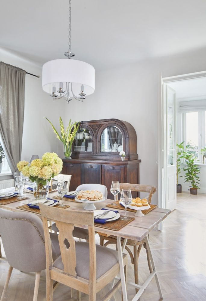 Niekwestionowaną gwiazdą jadalni jest wspaniały drewniany kredens. Staruszek zawdzięcza pani domu życie. – Należał do mojej babci – wspomina. – Pamiętam, że po przeprowadzce do nowego domu chciała się go pozbyć. Zdążyła nawet złapać za siekierę i odrąbać mu drzwiczki. Na szczęście zjawiłam się w porę i ją powstrzymałam. Miałam wtedy z 15 lat. Oświadczyłam, że kiedyś ten mebel stanie w moim domu. Kto by pomyślał, że uda mi się dotrzymać słowa?
