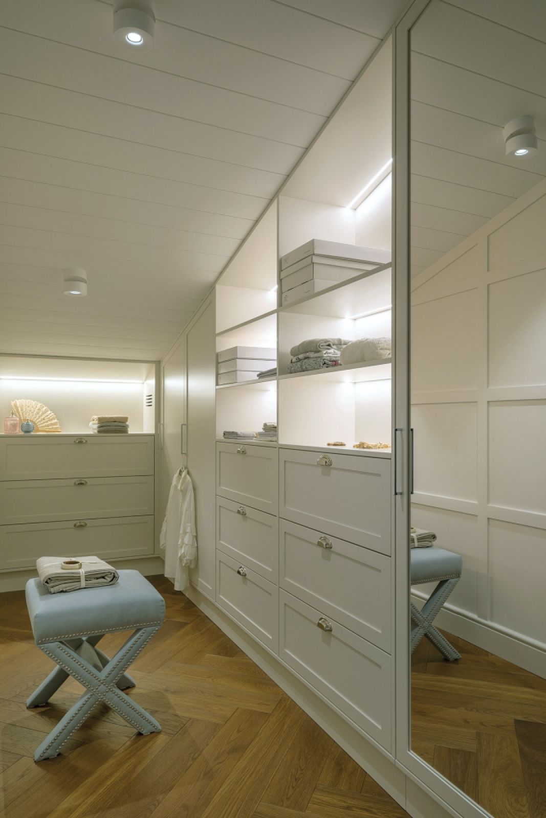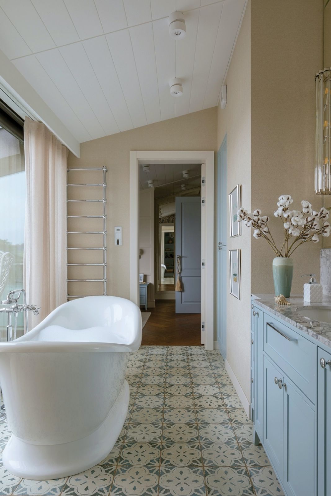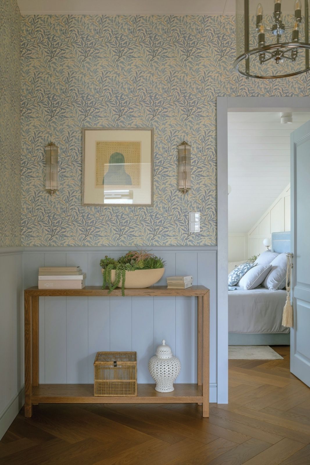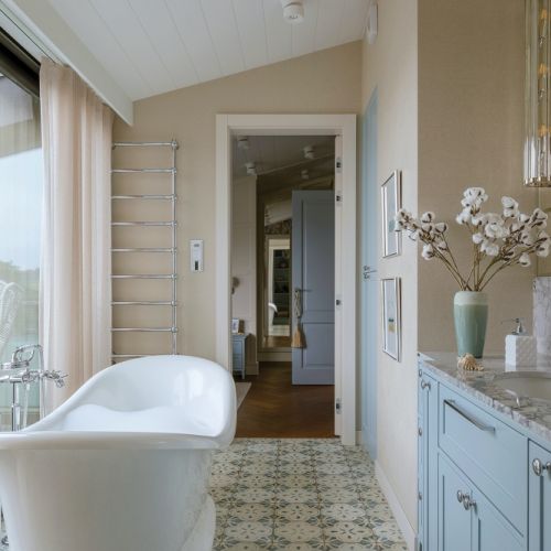 – Sufit pod skosami ma znacznie większą powierzchnię i może robić przytłaczające wrażenie – mówi architektka. – Dlatego chcieliśmy, żeby coś się na nim zadziało, staraliśmy się rozbić wizualnie jego olbrzymią płaszczyznę. Od początku wiedzieliśmy, że mieszkanie będzie miało charakter wakacyjno-weekendowy i klasyczną stylizację. Postanowiliśmy więc, nawiązując do skandynawskich upodobań właścicieli, którzy mieszkają na stałe w Szwecji, stworzyć wrażenie malowanego na biało, drewnianego sufitu. Pokryliśmy go sztukateryjnymi listewkami, które imitują drewniane panele.