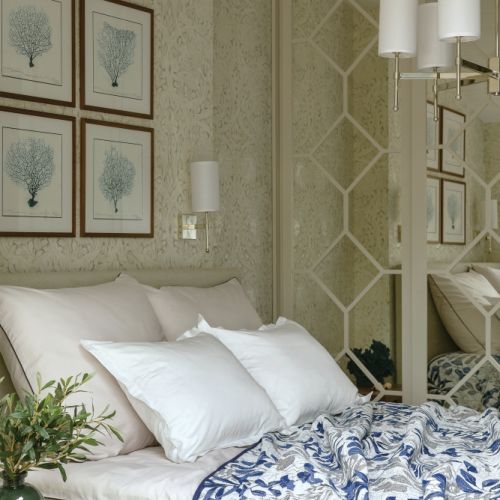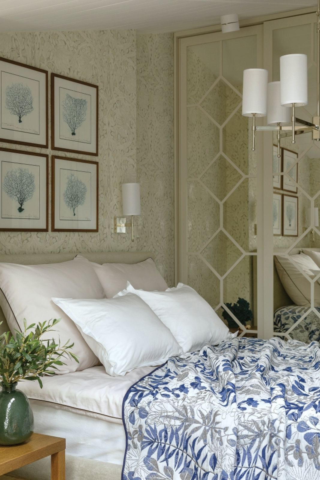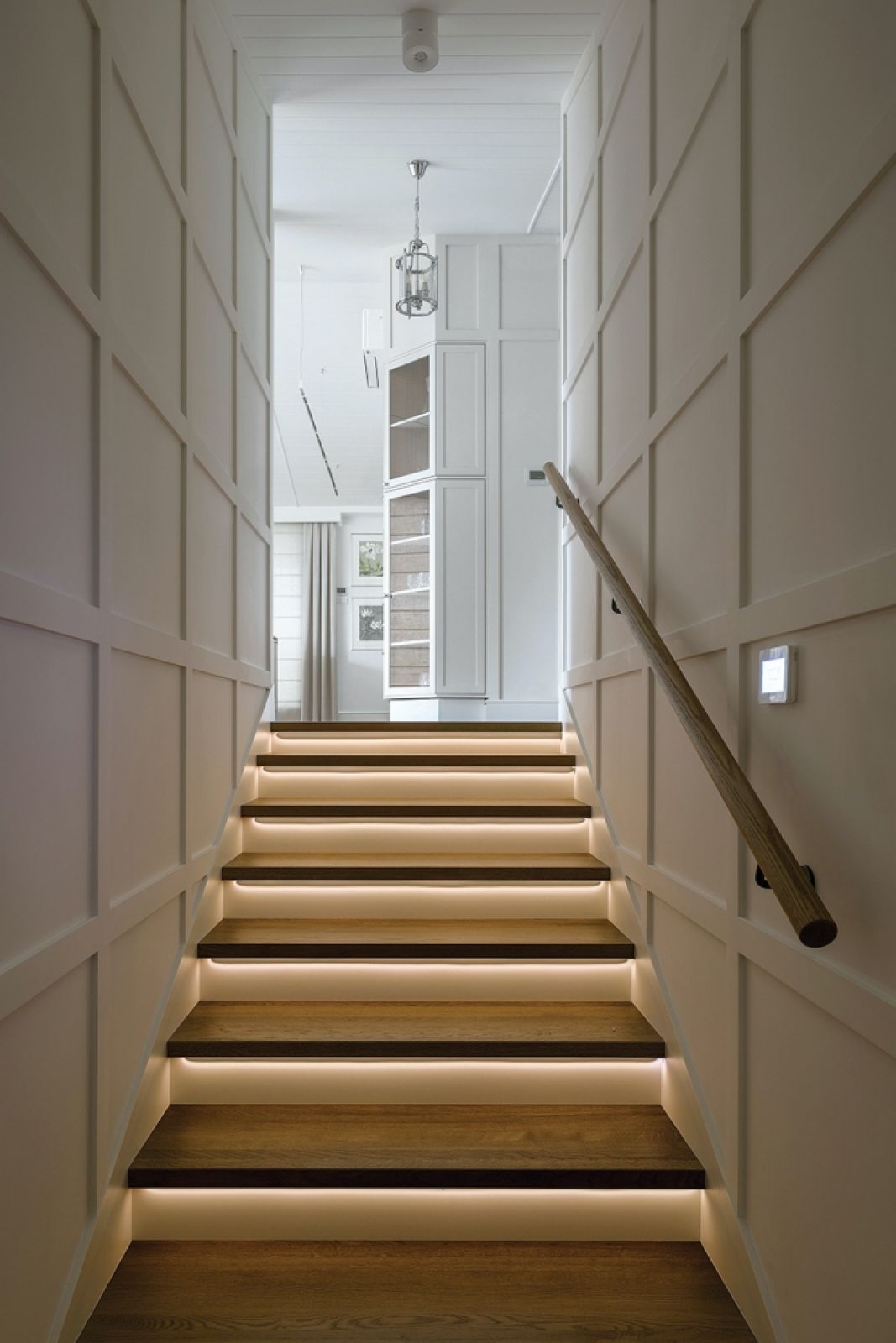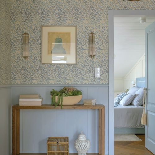 – Sufit pod skosami ma znacznie większą powierzchnię i może robić przytłaczające wrażenie – mówi architektka. – Dlatego chcieliśmy, żeby coś się na nim zadziało, staraliśmy się rozbić wizualnie jego olbrzymią płaszczyznę. Od początku wiedzieliśmy, że mieszkanie będzie miało charakter wakacyjno-weekendowy i klasyczną stylizację. Postanowiliśmy więc, nawiązując do skandynawskich upodobań właścicieli, którzy mieszkają na stałe w Szwecji, stworzyć wrażenie malowanego na biało, drewnianego sufitu. Pokryliśmy go sztukateryjnymi listewkami, które imitują drewniane panele.