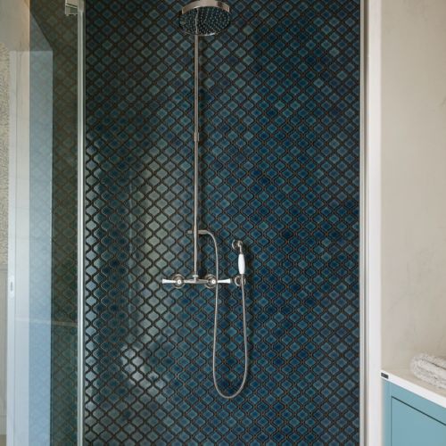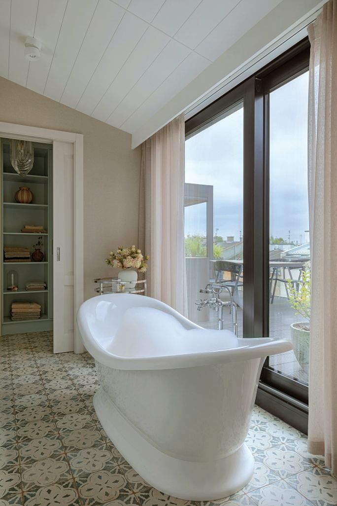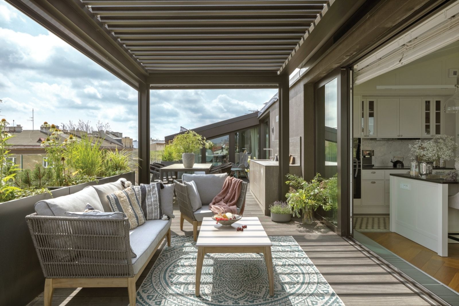 Były plany, by na olbrzymim 44-metrowym tarasie zainstalować jacuzzi. Jednak po naradach zrezygnowano z tego pomysłu – z mieszkania nie korzysta się przez cały rok, a wanna zewnętrzna z hydroterapią wymaga ciągłej konserwacji. Zamiast tego na tarasie stanęła specjalnie zaprojektowana kuchnia letnia. Sąsiaduje z jadalnią, a ta przylega do strefy wypoczynkowej z pergolą, która nawet w gorące dni daje ochłodę.