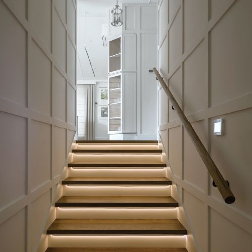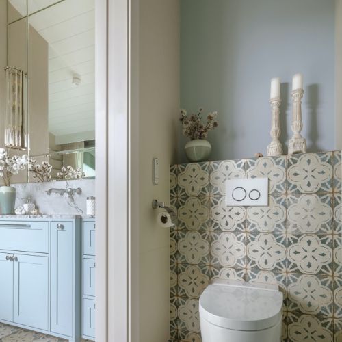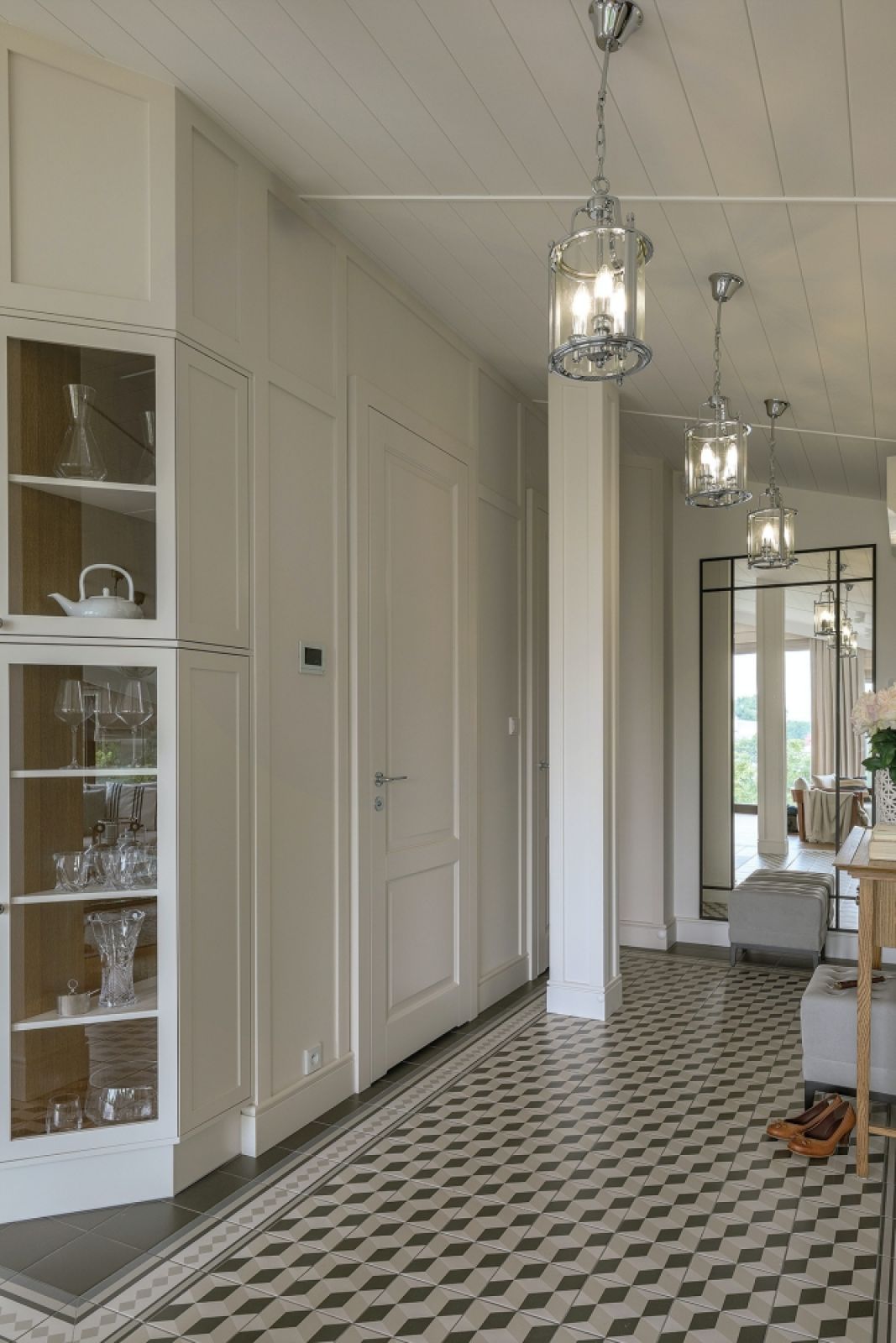 Odrębność holu podkreślona została też przez inną posadzkę – z płytkami. Z niego przechodzi się do zamykanej drzwiami strefy prywatnej, a naprzeciwko – do strefy dziennej z toaletą dla gości. W holu wygospodarowano też sporo miejsca do przechowywania.