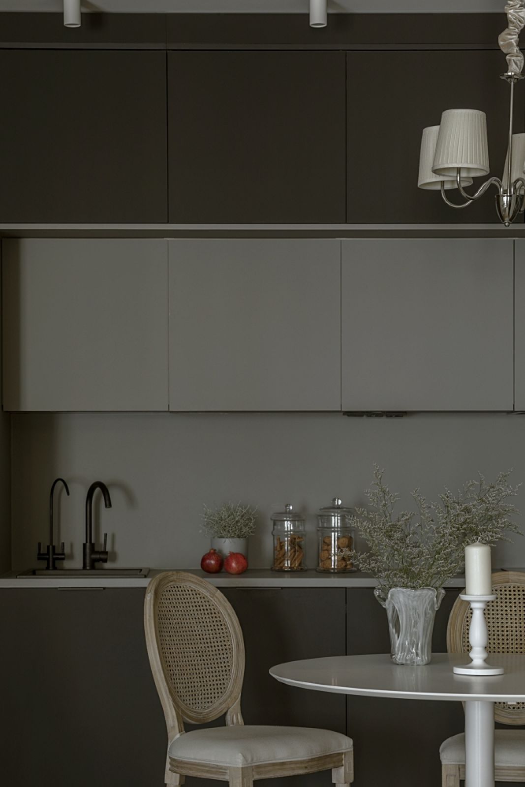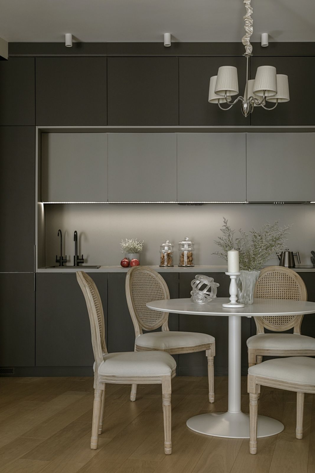 Jest jeszcze inny zaskakujący zabieg – czarna zabudowa kuchenna z odsuniętymi w głąb podświetlonymi wiszącymi szafkami o szarych frontach. To dodaje całości głębi i wydłuża perspektywę patrzącemu na kuchnię z salonu. Bo czerń, kiedy umiejętnie się ją stosuje, wcale nie pomniejsza i nie zamyka przestrzeni.