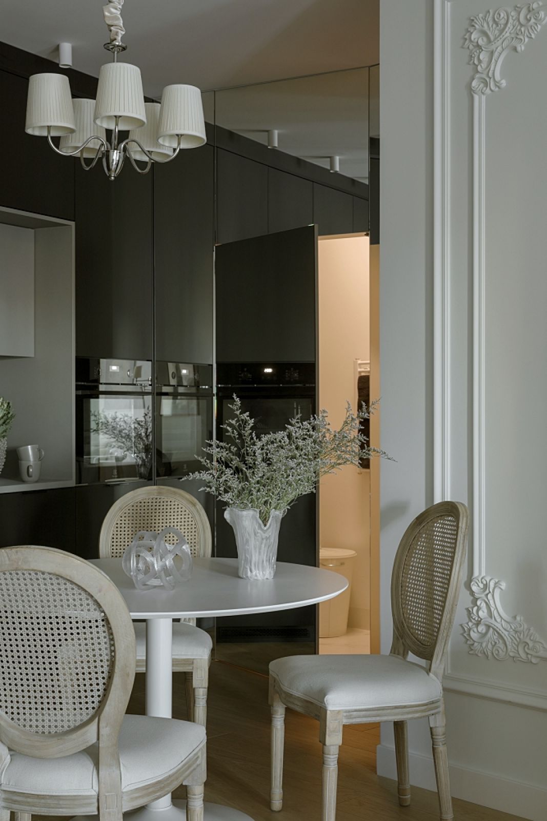 Architektowi bardzo zależało na optycznym powiększeniu tego mieszkania i ukryciu wejścia do pralni. Ściana, na której kończy się ciąg mebli kuchennych, została w związku z tym obłożona lustrami (łącznie z drzwiami prowadzącymi do tego pomieszczenia). Zabieg ten spowodował wizualne wydłużenie całej przestrzeni. Widać to już od progu, bo lustrzana ściana znajduje się naprzeciwko drzwi wejściowych.
